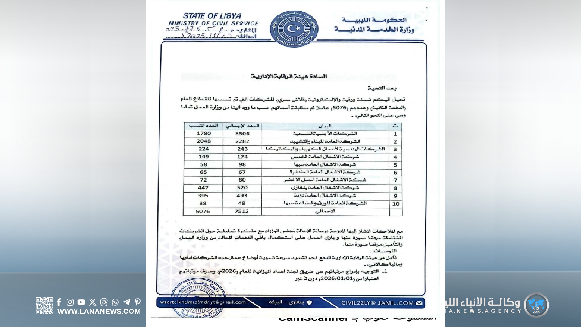 بنغازي 09 نوفمبر 2025 (الأنباء الليبية) – أحالت وزارة الخدمة المدنية، بالحكومة الليبية، تقريرًا مُفصلًا إلى هيئة الرقابة الإدارية، يتناول أوضاع الشركات الأجنبية المنسحبة والمتعثرة والمنحلة، تنفيذًا لتوجيهات رئيس الوزراء، الدكتور أسامة حماد، وبإشراف من الوزير محمود أبونعامة.