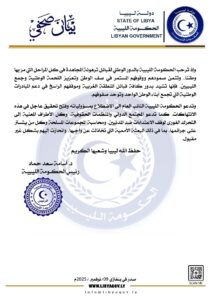وفي ختام بيانها، دعت الحكومة الليبية النائب العام إلى فتح تحقيق عاجل في هذه الانتهاكات.