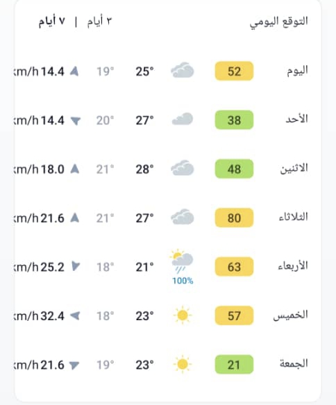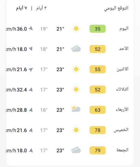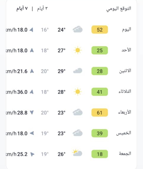 وتبقى نسب الرطوبة مرتفعة في المناطق الساحلية، فيما تُصنَّف جودة الهواء بأنها معتدلة مع رياح متوسطة السرعة.