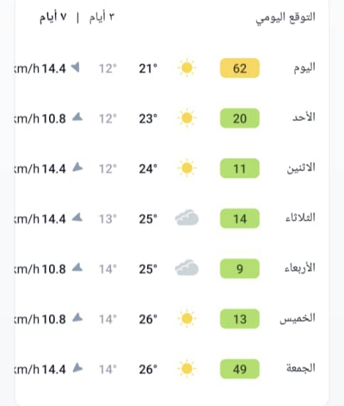 وفي الساحل الغربي، تسود أجواء مستقرة عمومًا، مع توقع ارتفاع تدريجي في درجات الحرارة مطلع الأسبوع، يعقبه انخفاض تدريجي لاحقًا.