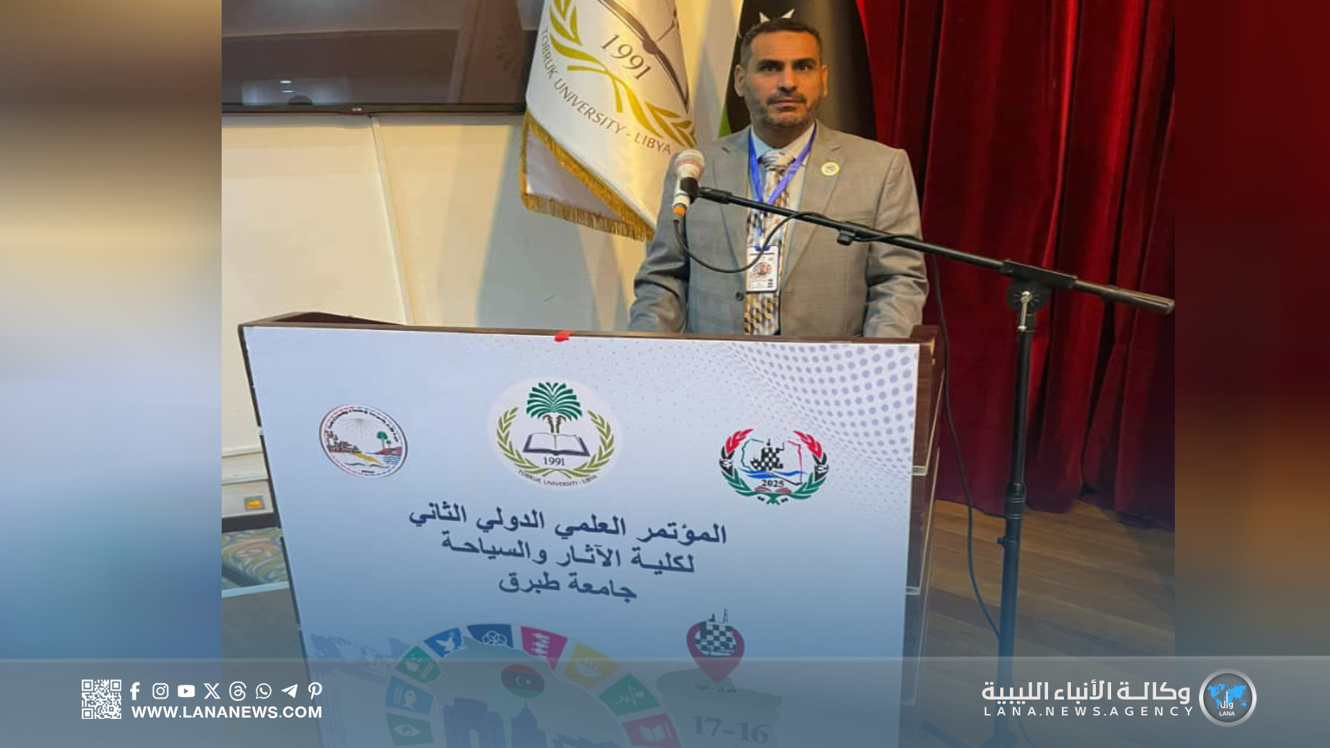 وفي تصريح خاص لـ«الأنباء الليبية»، قال عضو هيئة التدريس والمشارك بالمؤتمر ياسين الحسنوني: إنه شارك بورقة بحثية بعنوان «دور الإعلام كوسيط لتنشيط الاستثمار السياحي والتنمية المستدامة في ليبيا – دراسة تحليلية ميدانية»، موضحا أن بحثه تناول الدور الحيوي لوسائل الإعلام في رفع الوعي السياحي وتسليط الضوء على المقومات الطبيعية والتاريخية التي تزخر بها ليبيا، إضافة إلى تأثير الخطاب الإعلامي في تشكيل الصورة الذهنية لدى المستثمرين.