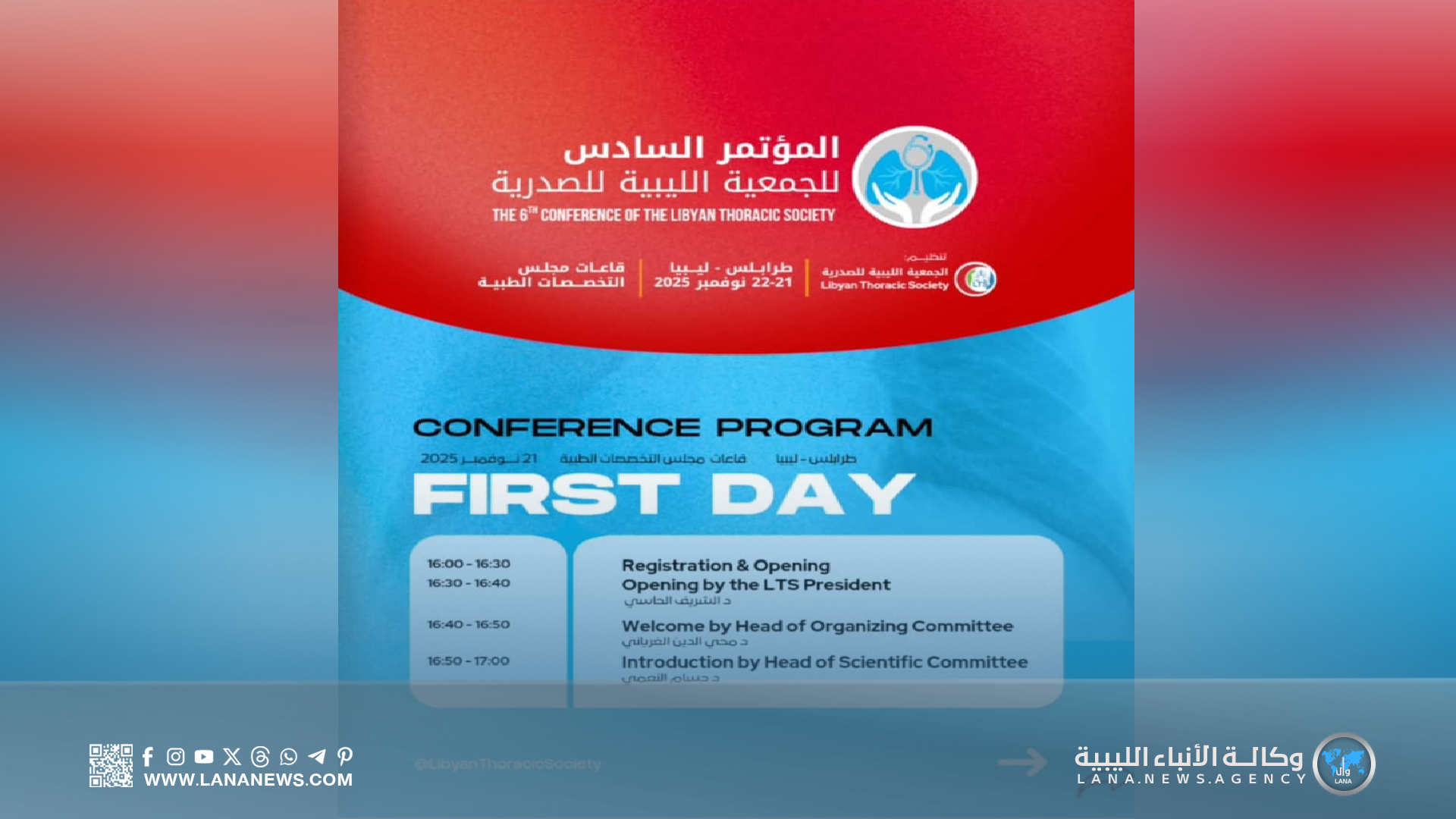 بنغازي 18 نوفمبر 2025 (الأنباء الليبية) – أكّد عضو اللجنة التحضيرية ومنسق المنطقة الشرقية بالجمعية الليبية للصدرية، الدكتور مروان قرقوم، اكتمال الترتيبات لانطلاق المؤتمر العلمي السادس للجمعية، والمقرر إقامته يومي الجمعة والسبت القادمين بمقر مجلس التخصصات الطبية بشارع الزاوية في طرابلس.