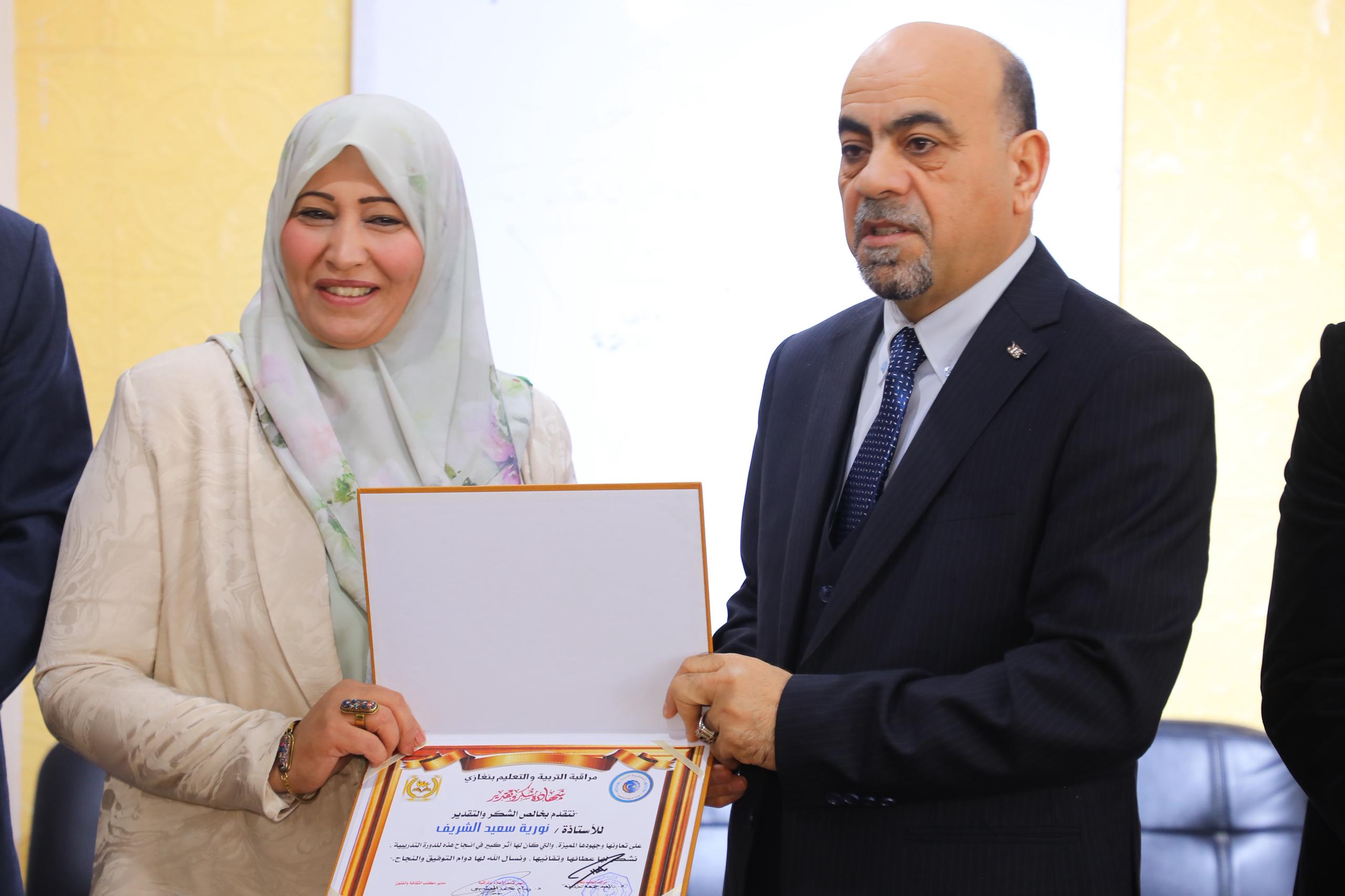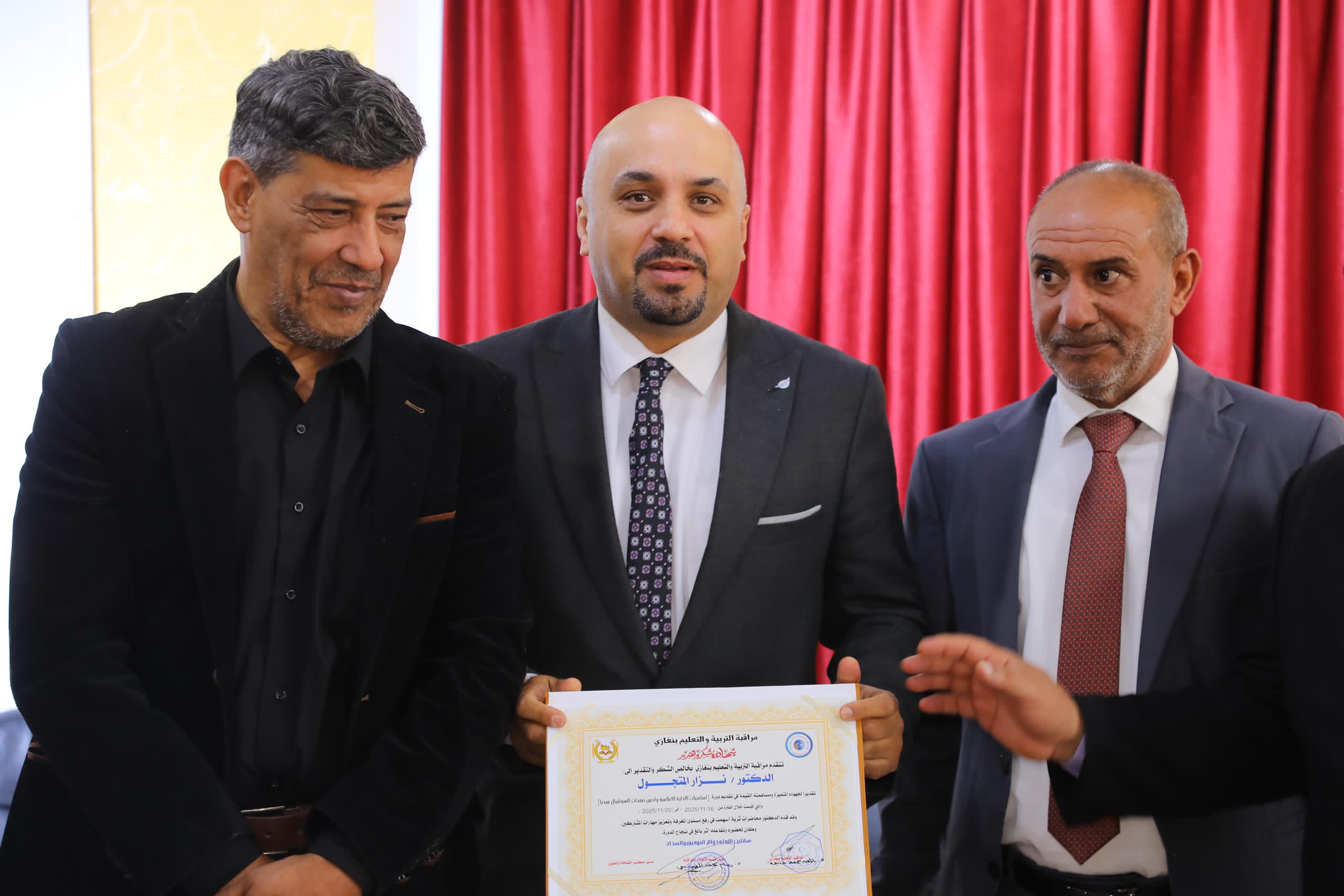 وفي ختام الفعاليات، جرى تكريم المدربين المشاركين، ومنسقي إدارات الإعلام بالمؤسسات التعليمية، إلى جانب المتدربين الذين شاركوا في البرنامج التدريبي، تقديرًا لجهودهم ومشاركتهم الفاعلة في إنجاح هذه الدورة. (الأنباء الليبية ـ بنغازي) ه ع