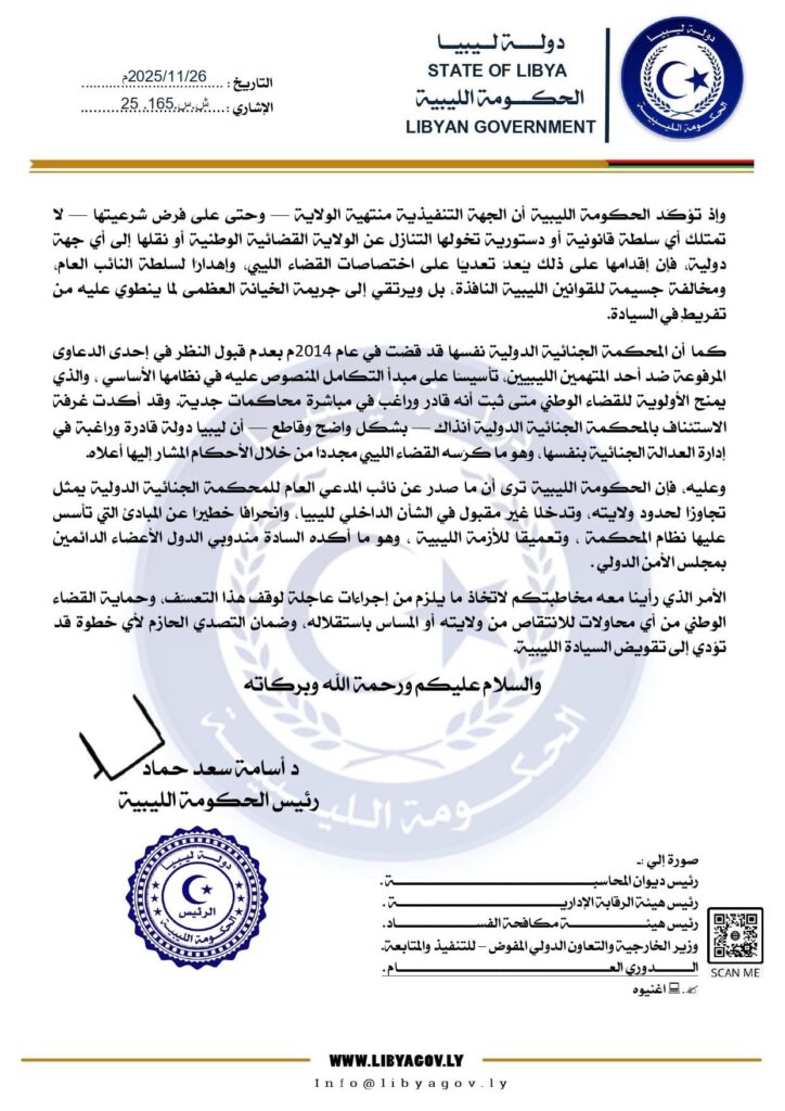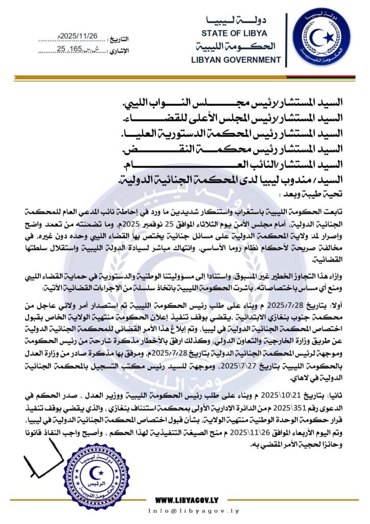 كما أوضحت الحكومة الليبية في بيانها أنه في تاريخ 21 / 10 /2025 وبناء على طلب رئيس الحكومة الليبية ووزير العدل أصدرت محكمة استئناف بنغازي حكمها الذي يقضي بوقف تنفيذ قرار حكومة الوحدة الوطنية بشأن قبول اختصاص المحكمة الجنائية الدولية في ليبيا.
