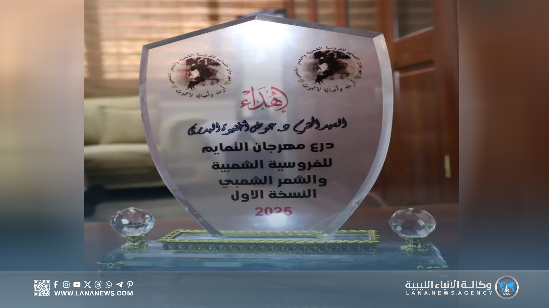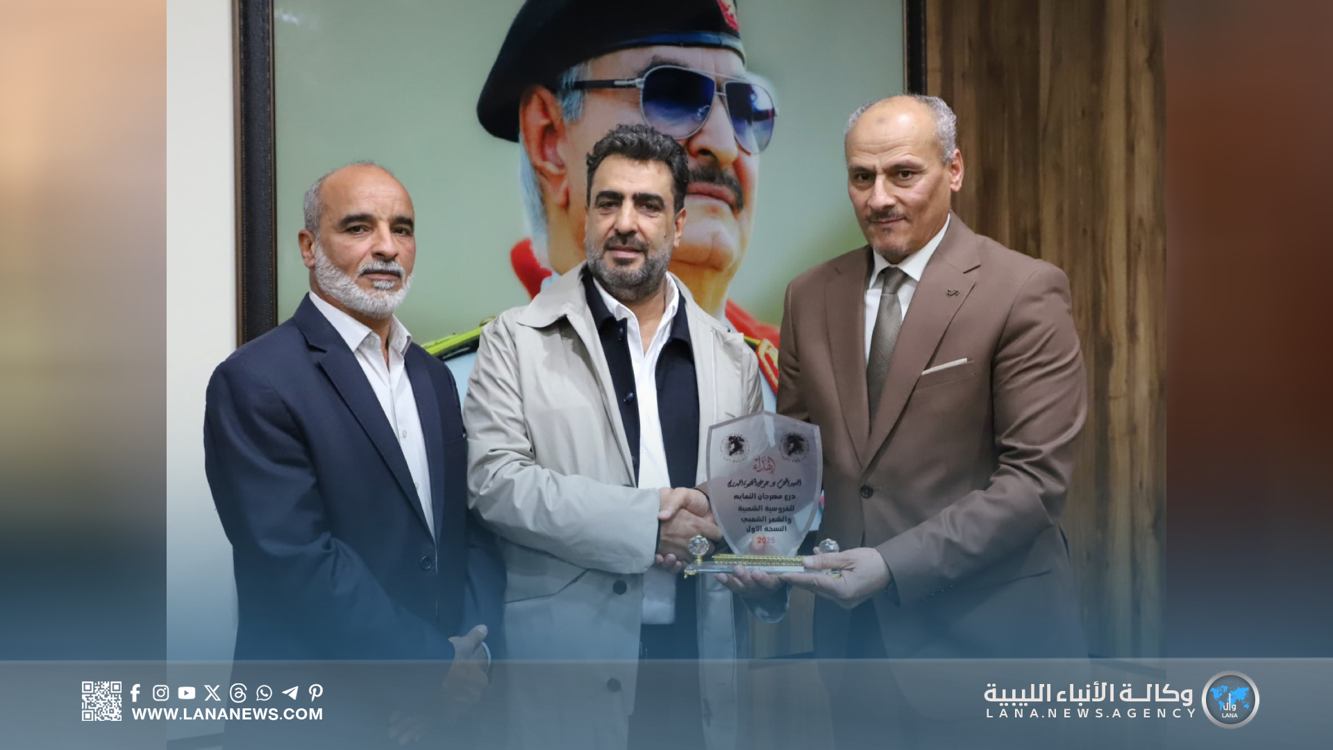 وفي ختام الاجتماع، قام الفريق أول التميمي وأعيان من قبيلة التمائم، نيابة عن عميد بلدية قصر بن غشير، بتكريم وزير الكهرباء، بدرع مهرجان التمايم للفروسية والشعر الشعبي، تقديرا لدعمه المهرجان ومساهمته في إنجاحه، معبرا عن اعتزاز القيادة العامة بمبادرات الوزارة التي تعزز الثقافة والتراث الوطني، وتربط بين المشاريع والخدمات المجتمعية والثقافية في البلاد. (الأنباء الليبية) س خ.