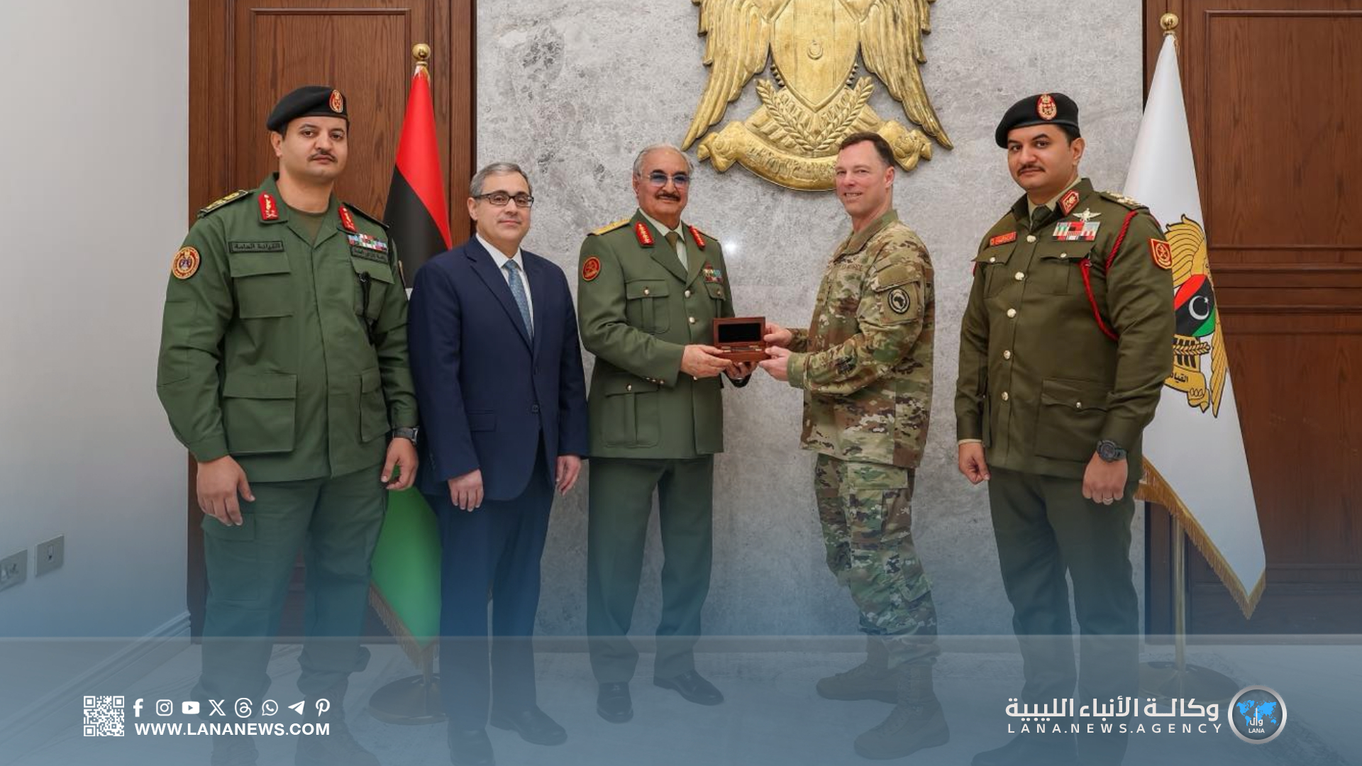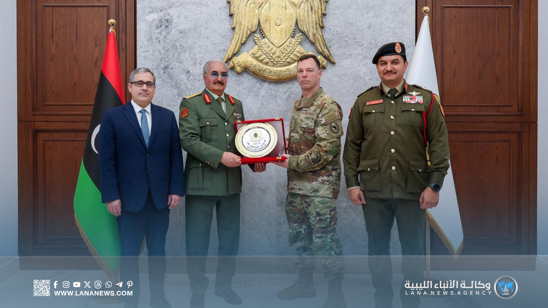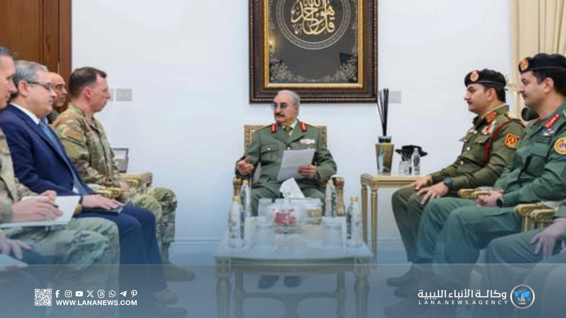 ورحب القائد العام بالوفد الزائر، مشيدا بعلاقات الشراكة المتميزة بين ليبيا والولايات المتحدة الأمريكية في مختلف المجالات، مؤكدا حرص القيادة العامة على تعزيز هذه الروابط بما يخدم الأمن والاستقرار في البلاد.
