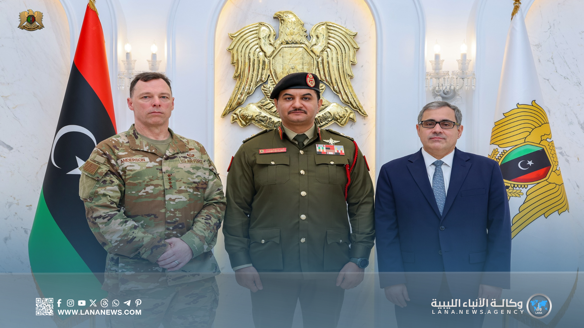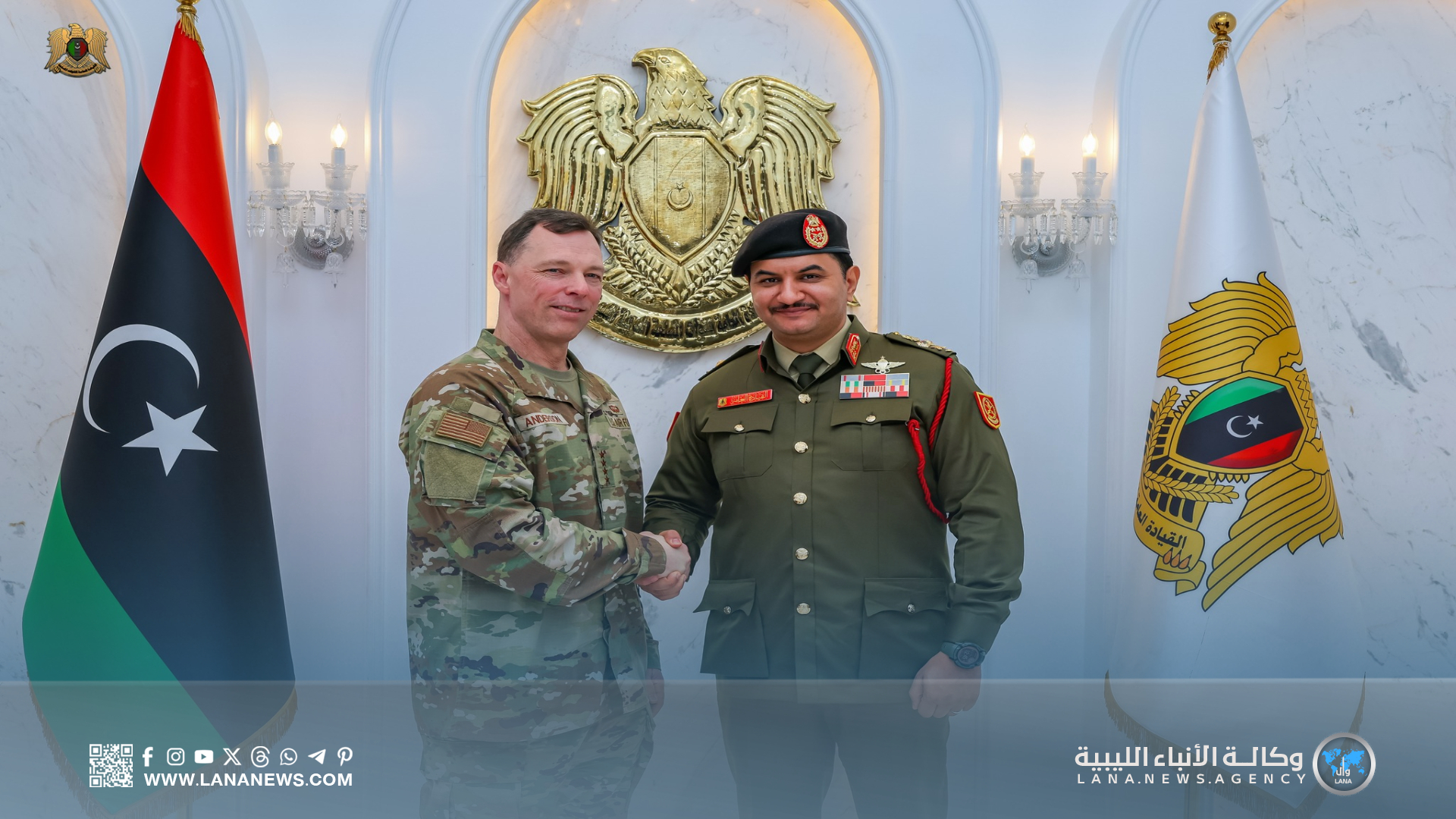 بنغازي 02 ديسمبر 2025 (الأنباء الليبية) – التقى نائب القائد العام، الفريق أول ركن صدام خليفة، بمقر القيادة العامة في بنغازي، قائد القيادة العسكرية الأمريكية في أفريقيا (أفريكوم) الفريق داغفين أندرسون، والقائم بأعمال السفارة الأمريكية لدى ليبيا، جيرمي برنت، والوفد المرافق لهما.