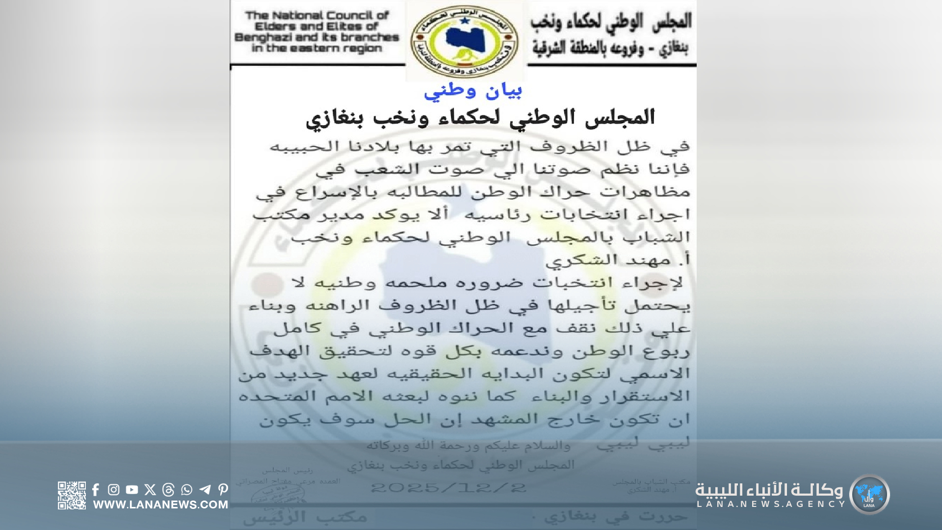 بنغازي 02 ديسمبر 2025 (الأنباء الليبية) – شدّد مدير مكتب الشباب بالمجلس الوطني لحكماء ونخب بنغازي، مهند الشكري، على ضرورة الإسراع في إجراء الانتخابات الرئاسية باعتبارها استحقاقًا وطنيًا عاجلًا لا يحتمل التأجيل، مُؤكدًا وقوف مكتبه الكامل مع مطالب الشعب الليبي والحراك الوطني.