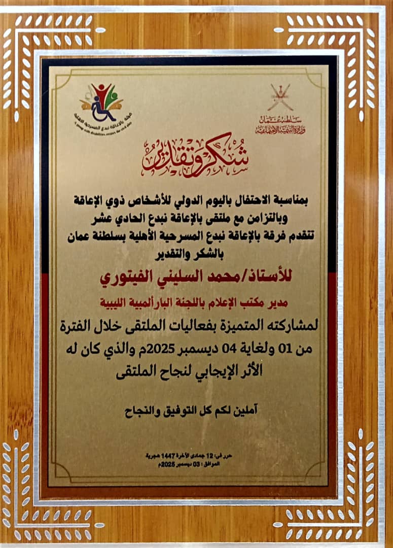 عُمان 04 ديسمبر 2025 (الأنباء الليبية) – كرّم الملتقى الحادي عشر “بالإعاقة نبدع” بسلطنة عُمان، اليوم الخميس 4 ديسمبر 2025، الناشط الحقوقي المختص بشؤون ذوي الإعاقة و مدير مكتب الإعلام والتوثيق باللجنة البارالمبية الليبية محمد السليني الفيتوري ، تقديراً لجهوده المتميزة في خدمة قضايا الأشخاص ذوي الإعاقة ودعمه المبادرات الإنسانية التي تهدف إلى تمكينهم وإبراز قدراتهم على المستويين المحلي والإقليمي.