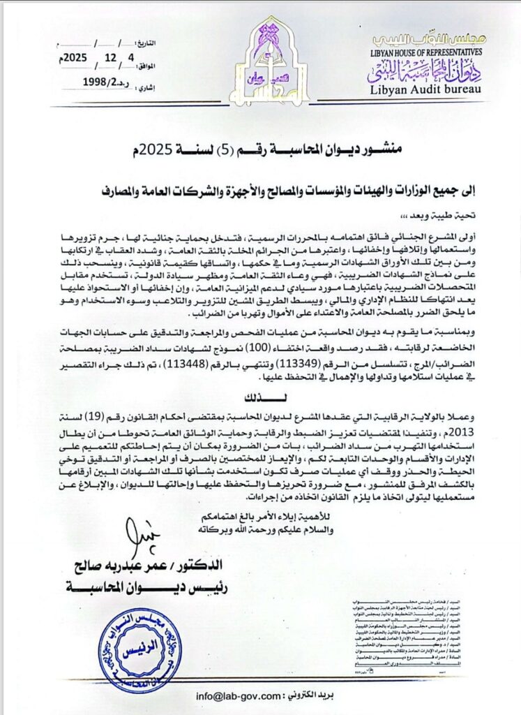 بنغازي 04 ديسمبر 2025 (الأنباء الليبية) – حذر ديوان المحاسبة في منشور عممه على جميع الوزارات والهيئات والمؤسسات العامة اليوم الخميس من تزايد حالات تزوير بعض المستندات المالية، خصوصاً النماذج المحاسبية التي تبدأ بالرقم (113349) وتنتهي بالرقم (113448).