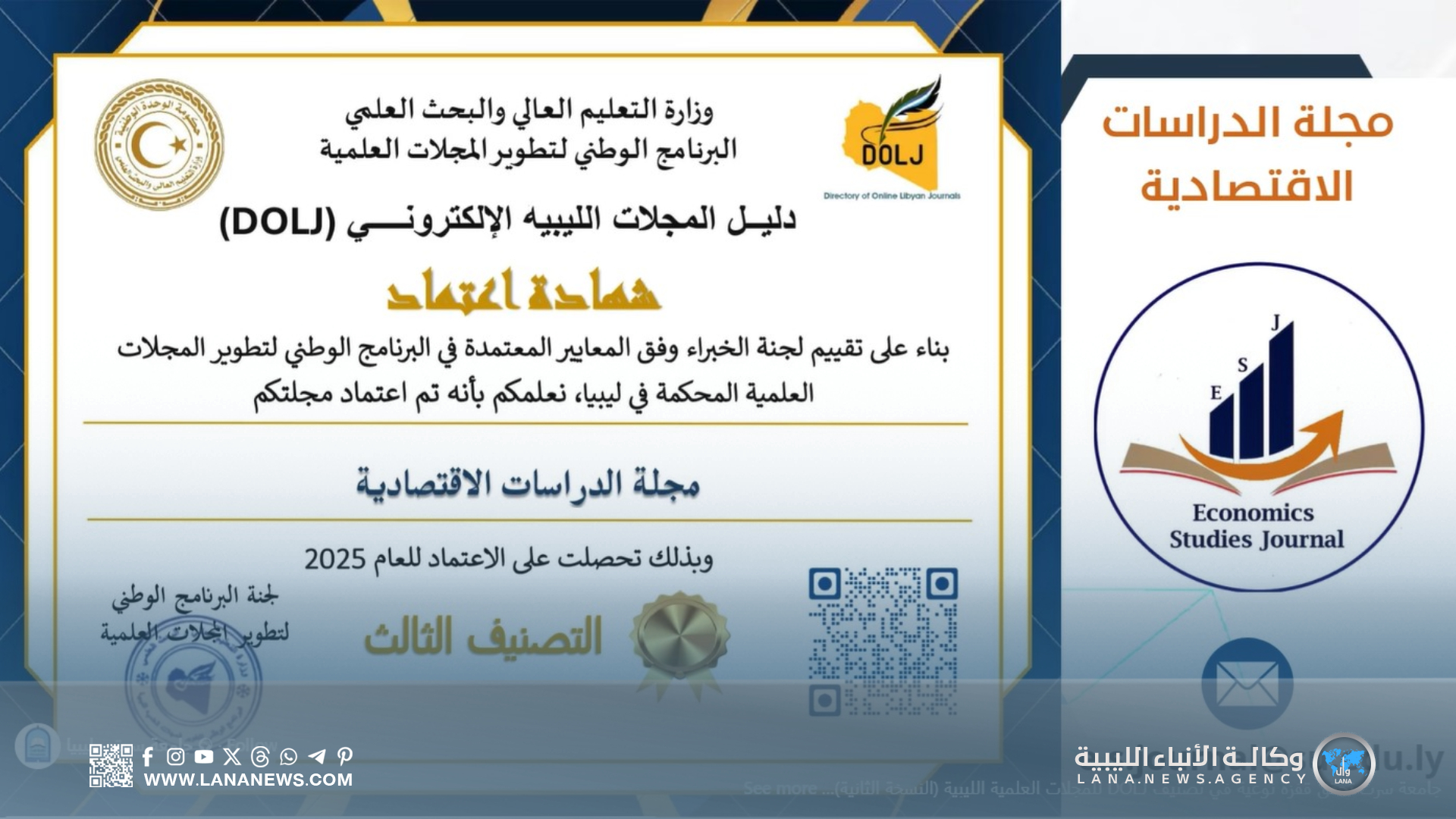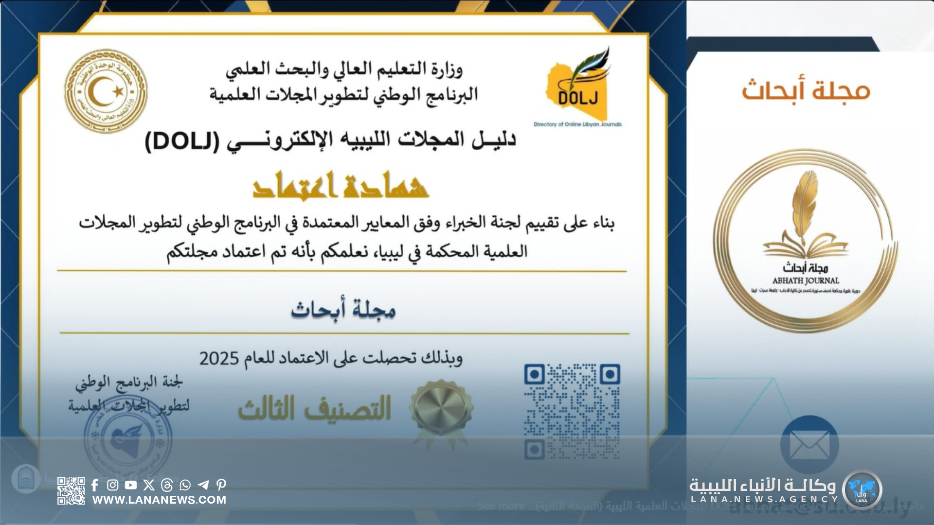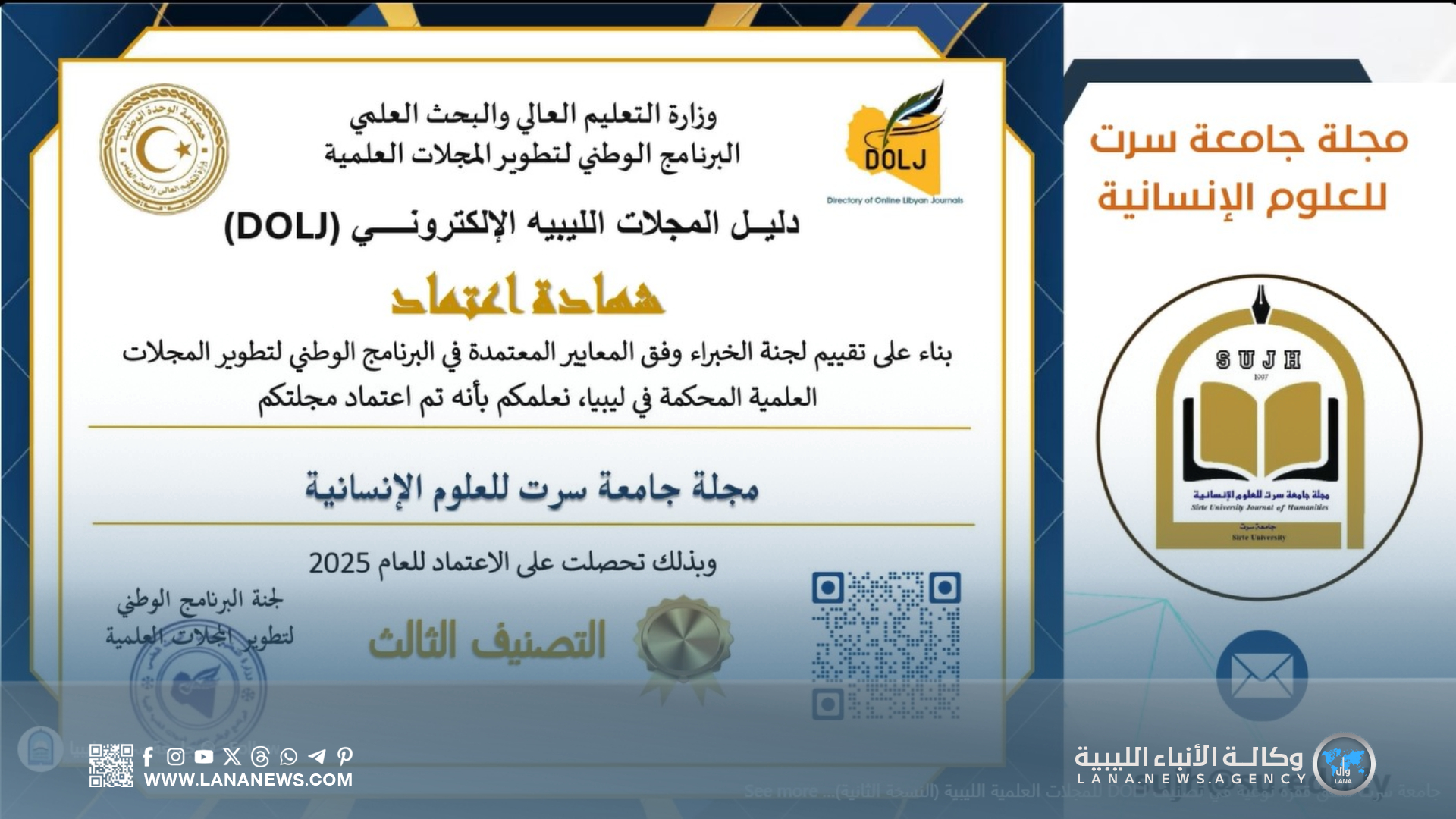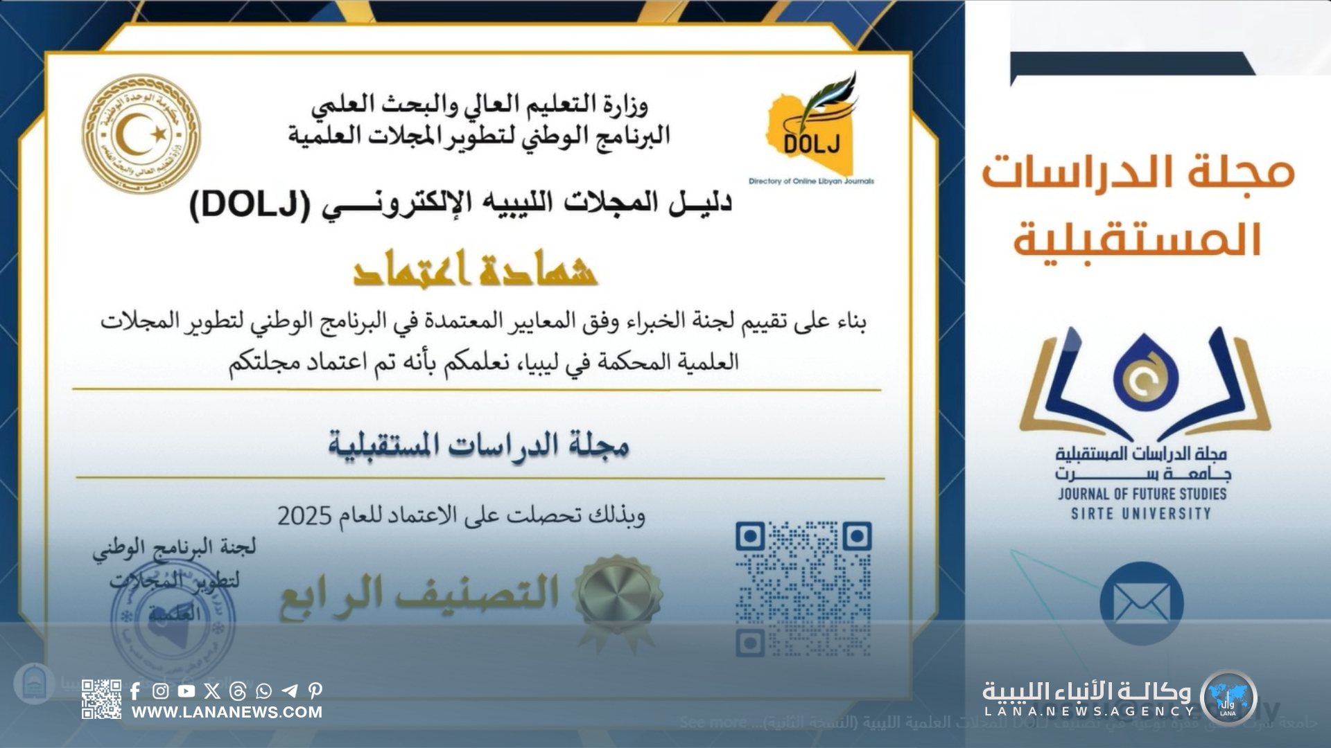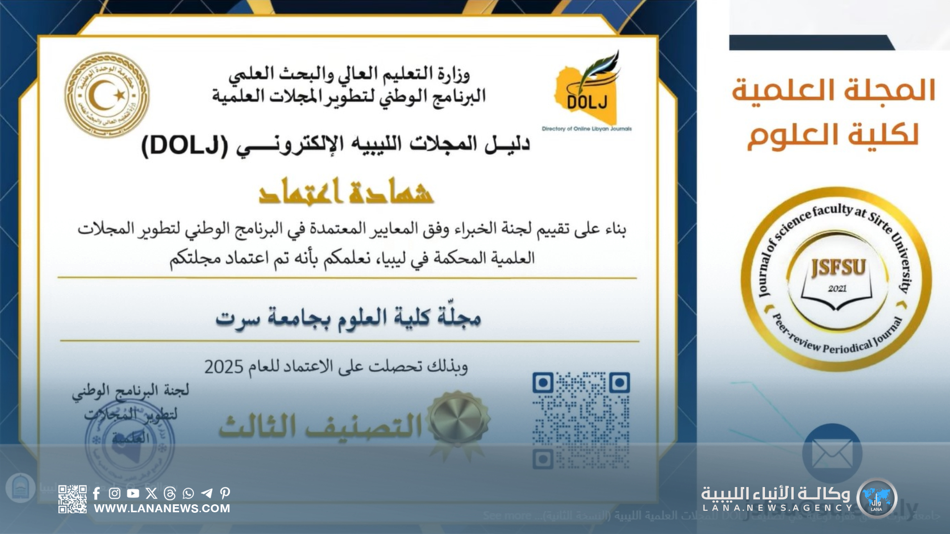 سرت 21 ديسمبر 2025 (الأنباء الليبية) – أعلن “دليل المجلات الليبية الإلكتروني” (DOLJ) نتائج النسخة الثانية من التصنيف المحلي للمجلات العلمية المحكمة، إذ شهدت جامعة سرت تقدمًا ملحوظًا بدخول مجلات جديدة وتحسن تصنيف بعض المجلات القائمة.
