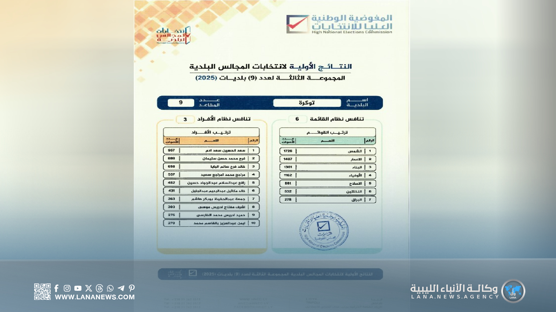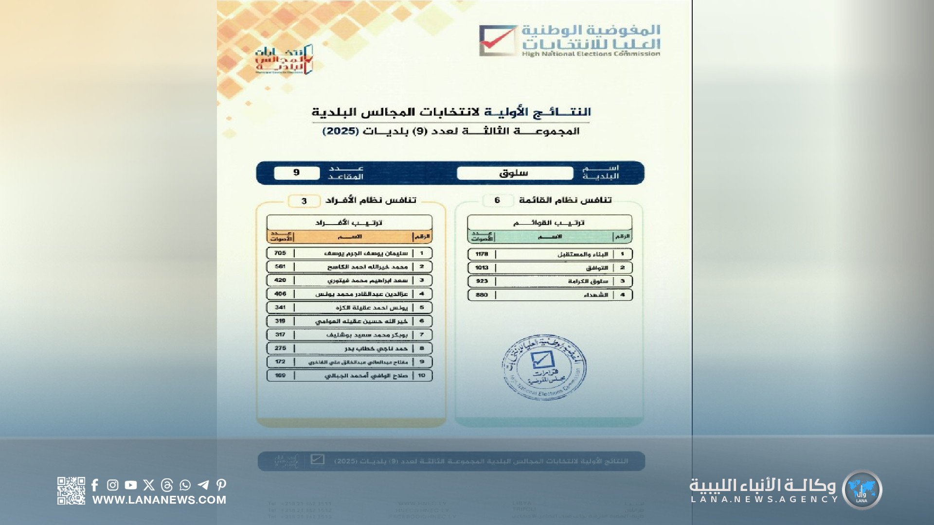 وأكدت المفوضية الوطنية العليا للانتخابات أن إعلان النتائج الأولية يأتي في إطار التزامها بتنفيذ الاستحقاقات الانتخابية وفق الأطر القانونية المعتمدة، واحترام إرادة الناخبين، وتعزيز الثقة في المسار الانتخابي باعتباره أحد الركائز الأساسية لبناء الدولة وترسيخ الحكم المحلي.