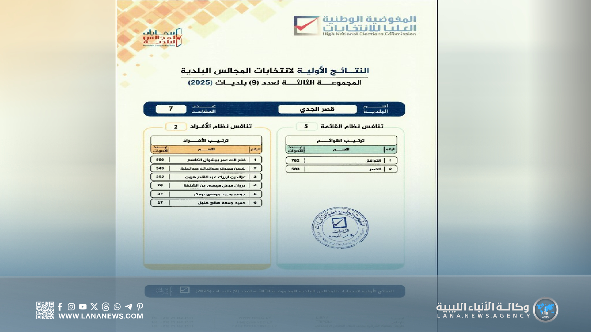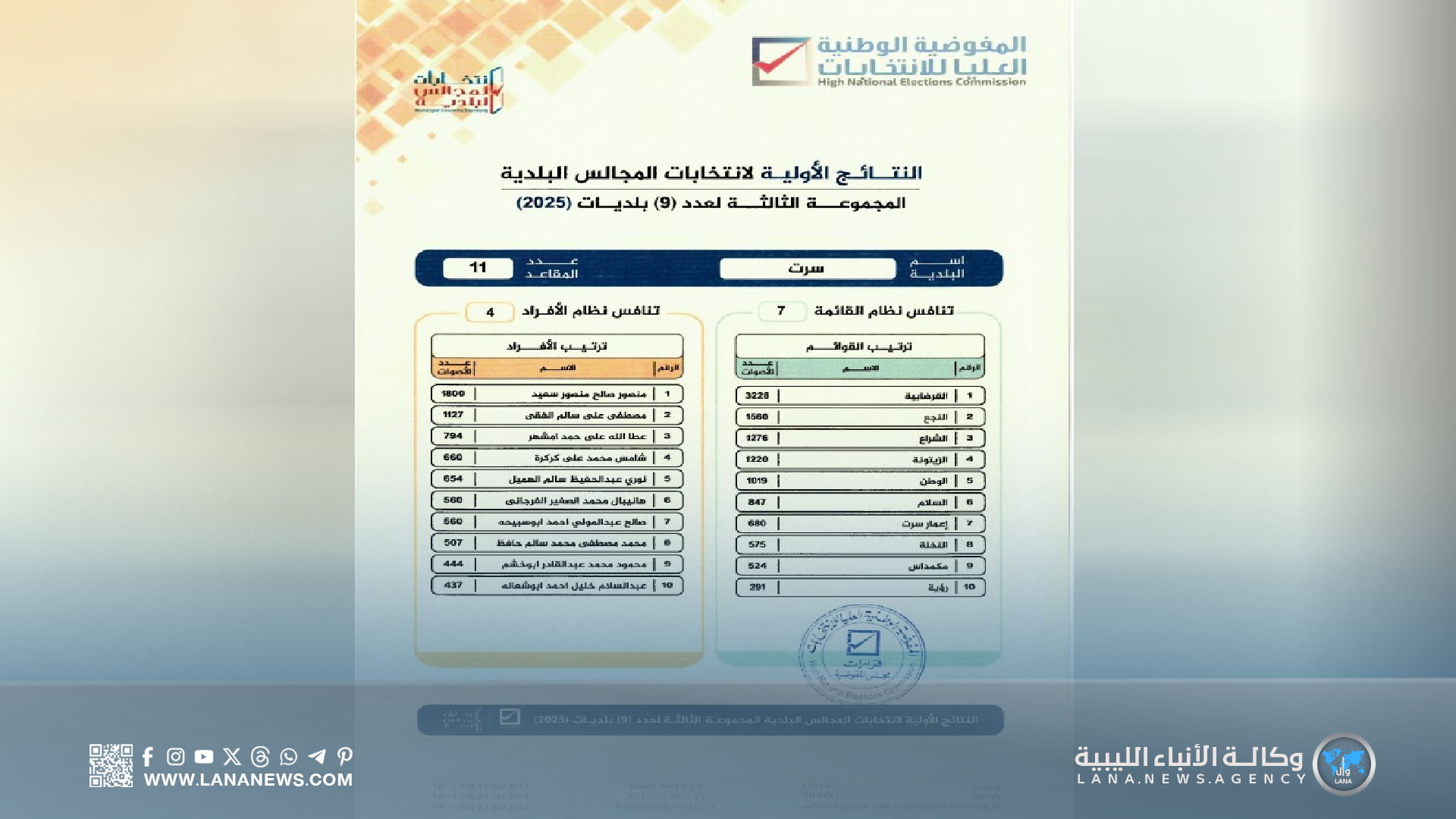 وأوضحت المفوضية أن القرار شمل اعتماد النتائج الأولية لانتخابات المجالس البلدية في تسع (9) بلديات، هي: طبرق، قصر الجدي، بنغازي، توكرة، قمينس، سلوق، الأبيار، سرت، وسبها، وذلك بعد استكمال كافة الإجراءات القانونية والفنية المعتمدة.