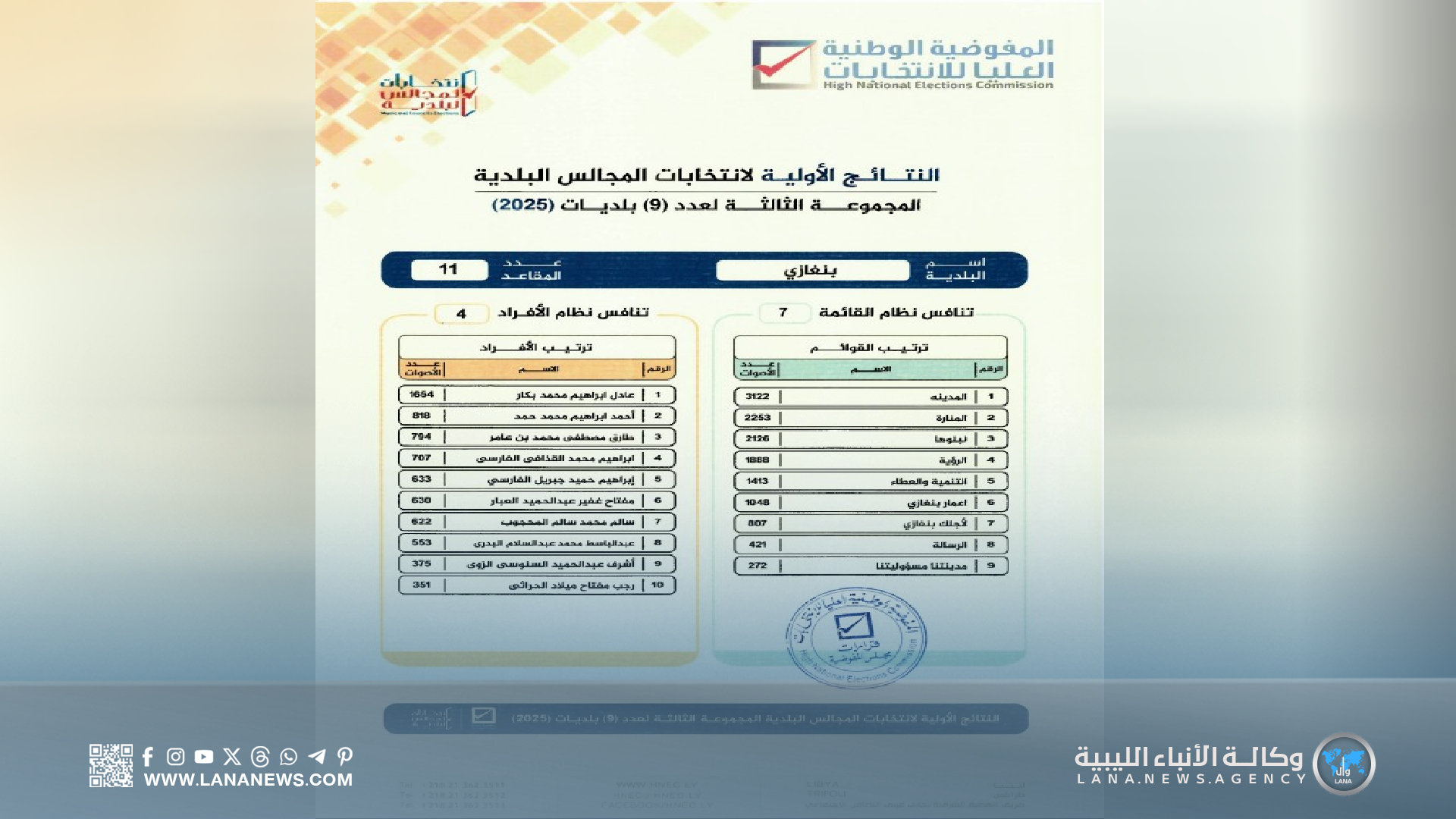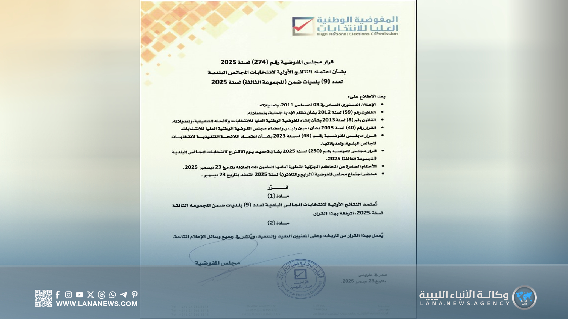 طرابلس 23 ديسمبر 2025 (الأنباء الليبية) – أعلنت المفوضية الوطنية العليا للانتخابات، الثلاثاء، اعتماد النتائج الأولية لانتخابات المجالس البلدية للمجموعة الثالثة لسنة 2025، وذلك بموجب القرار رقم (274) لسنة 2025، الصادر عن مجلس المفوضية.