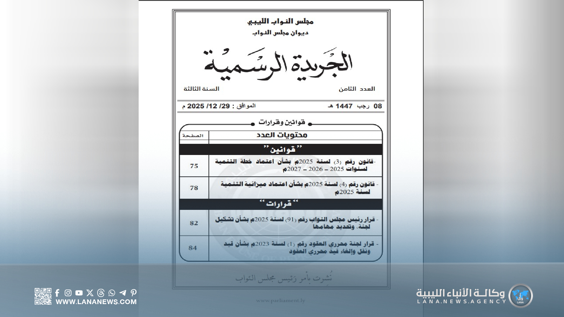 كما تضمن العدد قرار رئيس مجلس النواب رقم (91) لسنة 2025م بشأن تشكيل لجنة وتحديد مهامها، إلى جانب قرار لجنة محرري العقود رقم (1) لسنة 2023م بشأن قيد ونقل وإلغاء قيد محرري العقود.