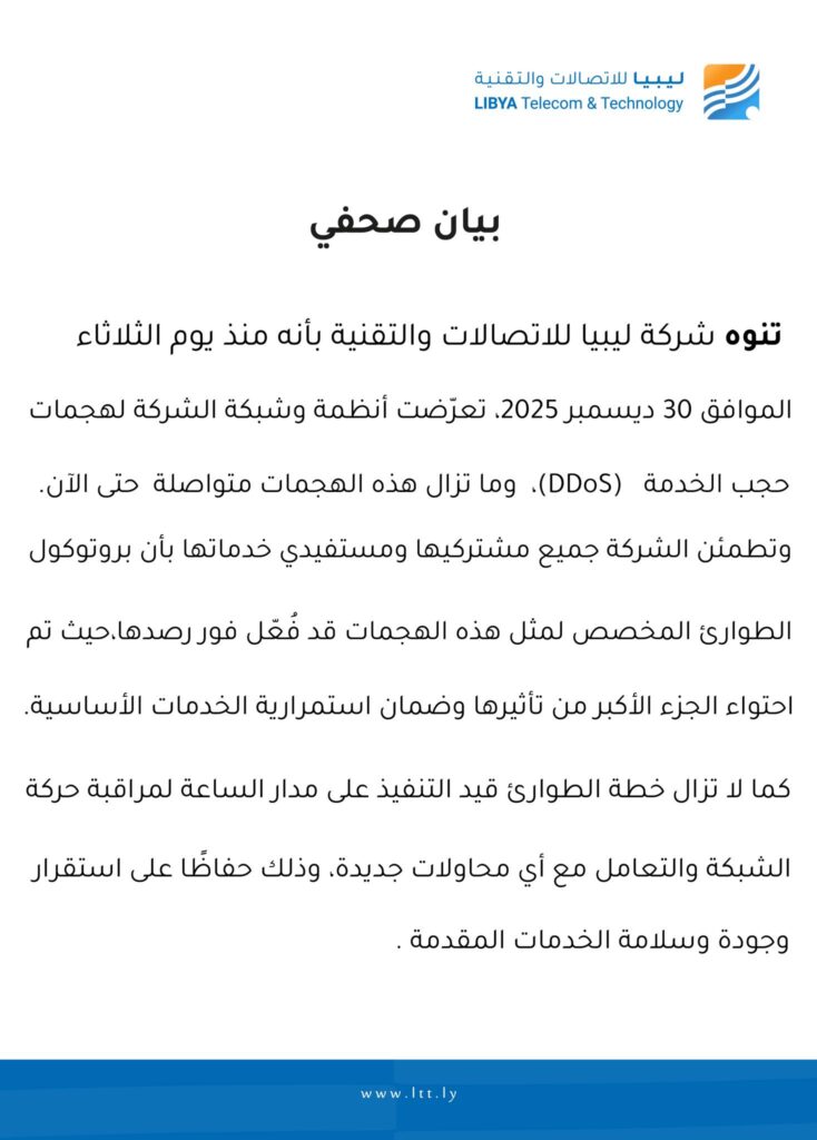 طرابلس 01 يناير 2026 (الأنباء الليبية) ـ أعلنت شركة ليبيا للاتصالات والتقنية أن أنظمة وشبكات الشركة تتعرض منذ يوم الثلاثاء الماضي لهجمات حجب الخدمة، مؤكدة أن هذه الهجمات ما تزال متواصلة حتى الآن.