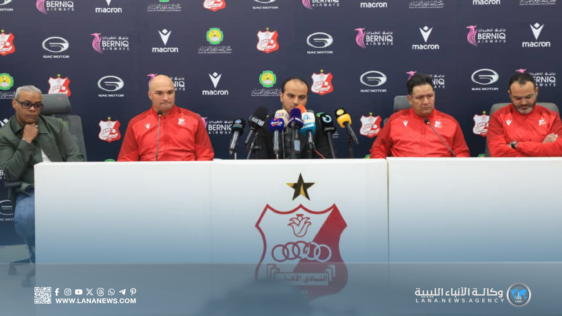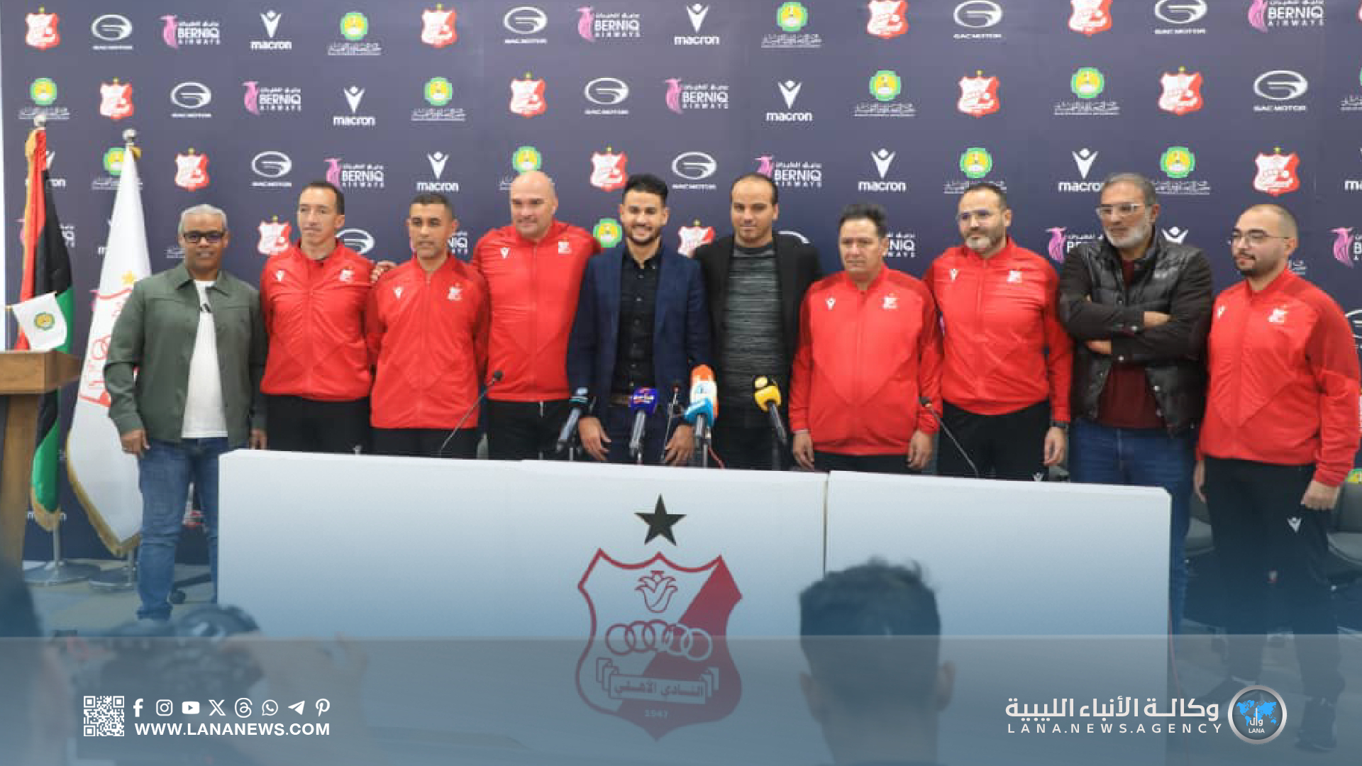 بنغازي 04 يناير 2026 (الأنباء الليبية) – قدّم نادي الأهلي بنغازي، مساء اليوم، بمقره في قاريونس، مؤتمرًا صحفيًا أعلن خلاله عن الطاقم الفني الجديد للفريق الأول لكرة القدم. واستعرض، في مستهل المؤتمر، الكابتن معتز بن عامر نائب رئيس مجلس الإدارة، الرؤية الجديدة والمستقبلية للنادي، مؤكدًا التركيز على إعادة بناء القاعدة الأساسية للأهلي.