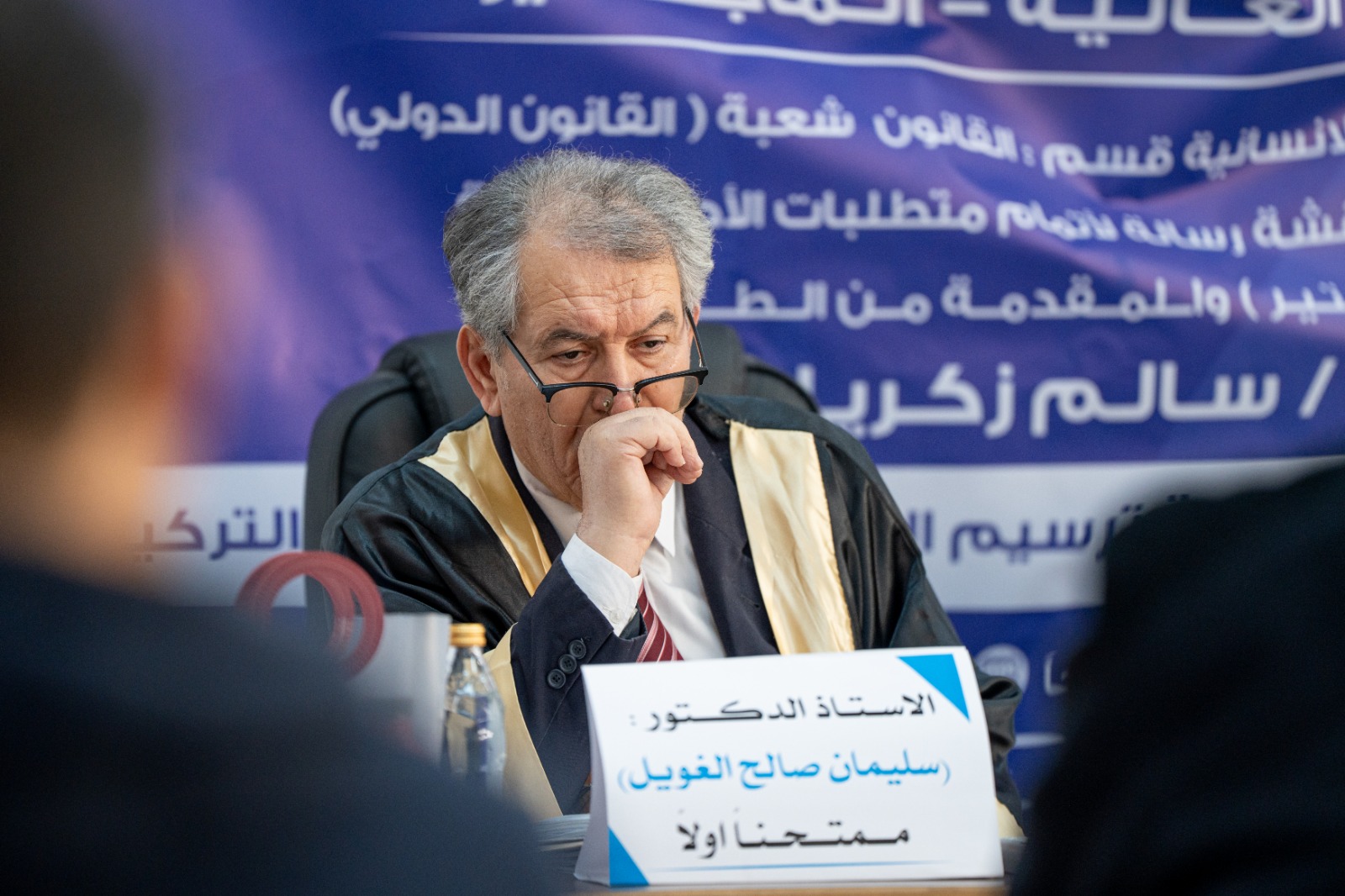 وتناولت الرسالة موضوعًا بالغ الحساسية والأهمية الاستراتيجية بعنوان: «الإشكاليات القانونية لاتفاقية ترسيم الحدود البحرية الليبية–التركية»، وهو ملف يمس السيادة الوطنية الليبية بشكل مباشر، ويكتسب راهنيته من ارتباطه بالقانون الدولي العام وقانون البحار، وما يترتب عليه من آثار قانونية وسياسية على المستويين الإقليمي والدولي، لا سيما في ظل التوترات القائمة بمنطقة شرق البحر المتوسط.