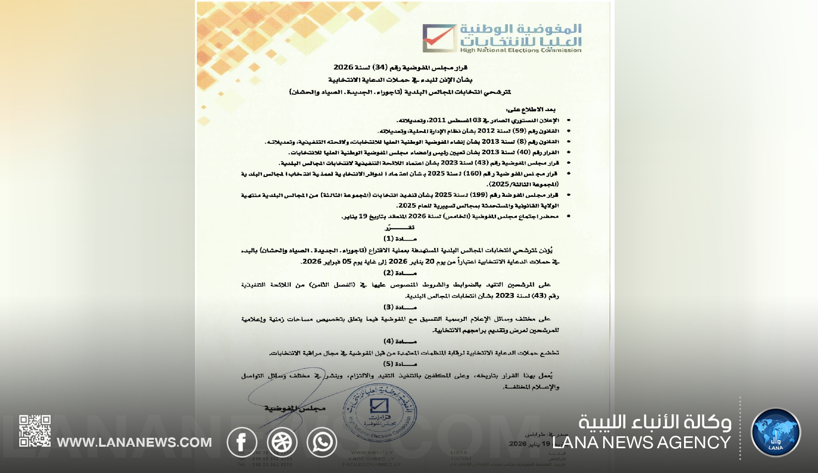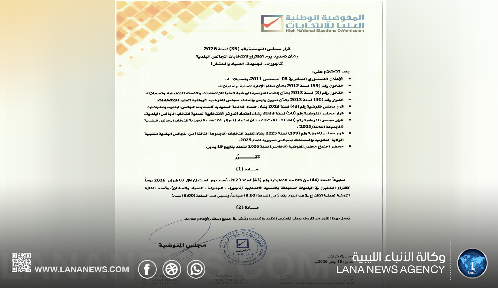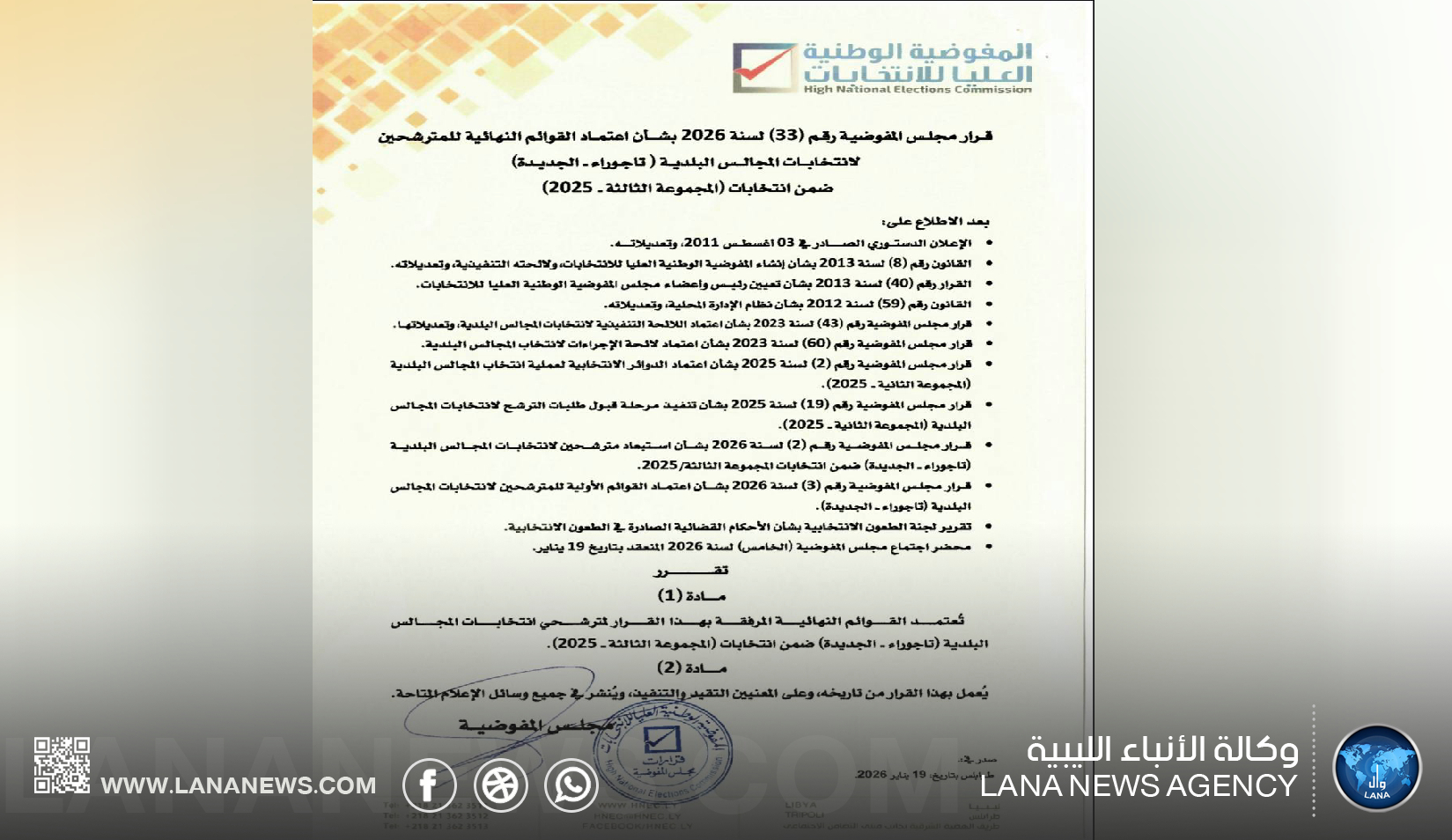 طرابلس 19 يناير 2026 (الأنباء الليبية) – أعلنت المفوضية الوطنية العليا للانتخابات، بدء تسجيل وكلاء مترشحي انتخابات المجالس البلدية، اعتبارًا من يوم غد الثلاثاء 20 يناير 2026.