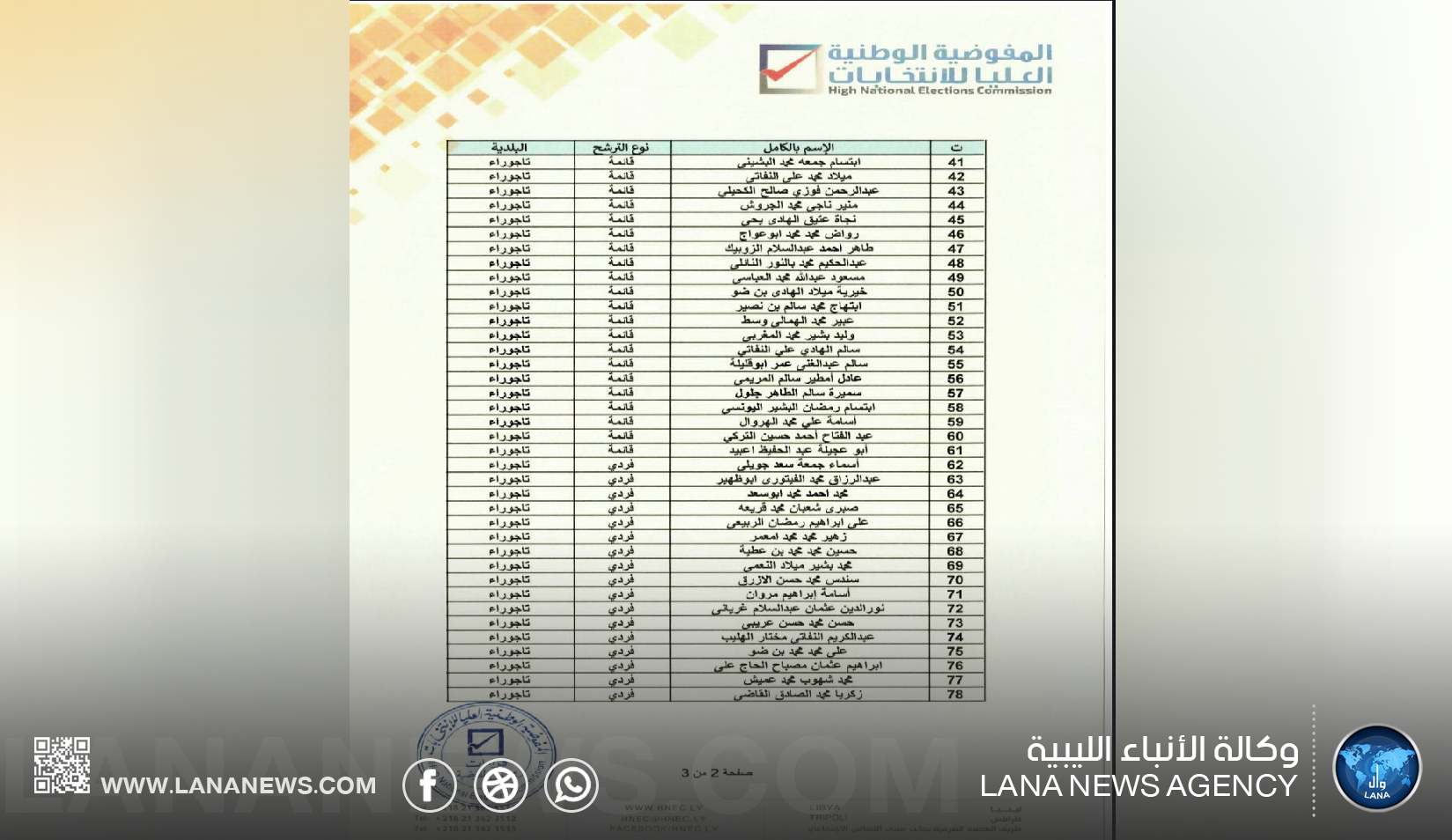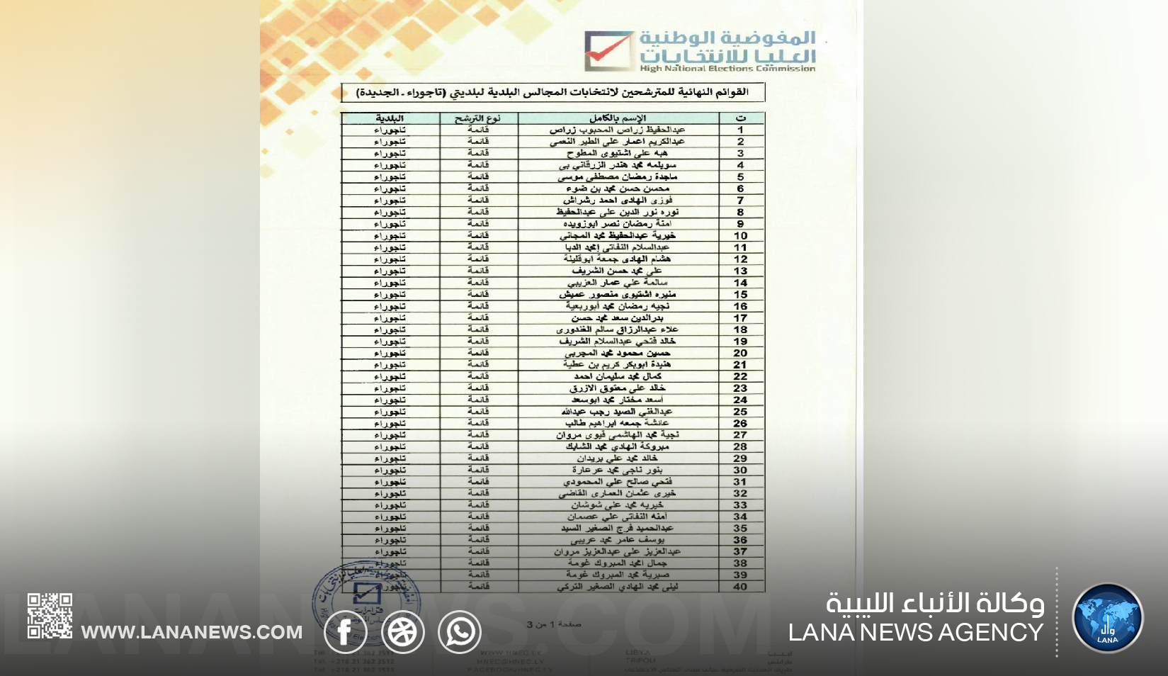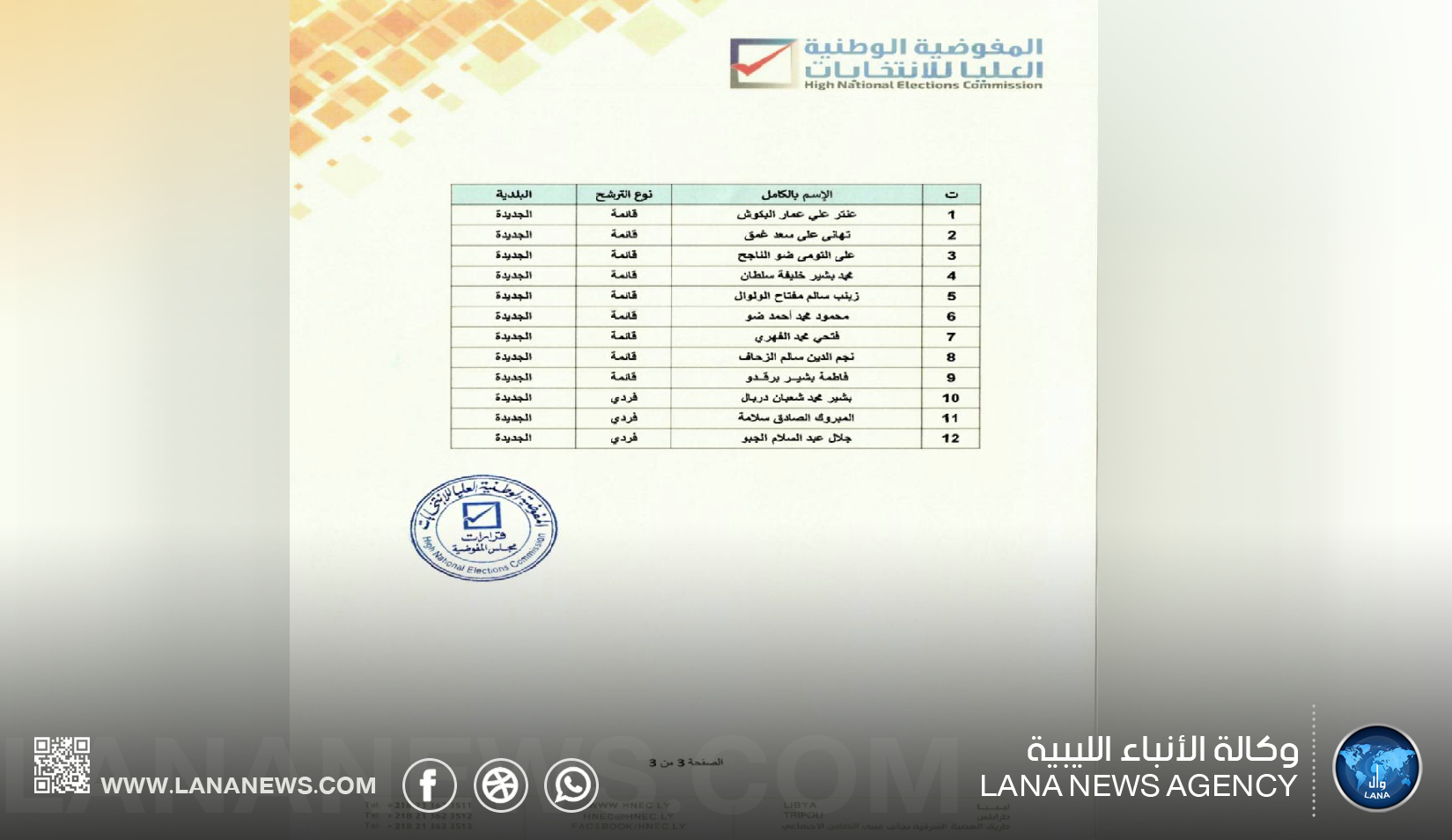 وأوضحت المفوضية، في بيان، أن التسجيل يشمل المترشحين بالنظامين الفردي والقائمة في بلديات (تاجوراء، الجديدة، الصياد والحشان)، على أن تُقدَّم طلبات اعتماد الوكلاء لدى مكتب الإدارة الانتخابية (طرابلس – الساحل الغربي).