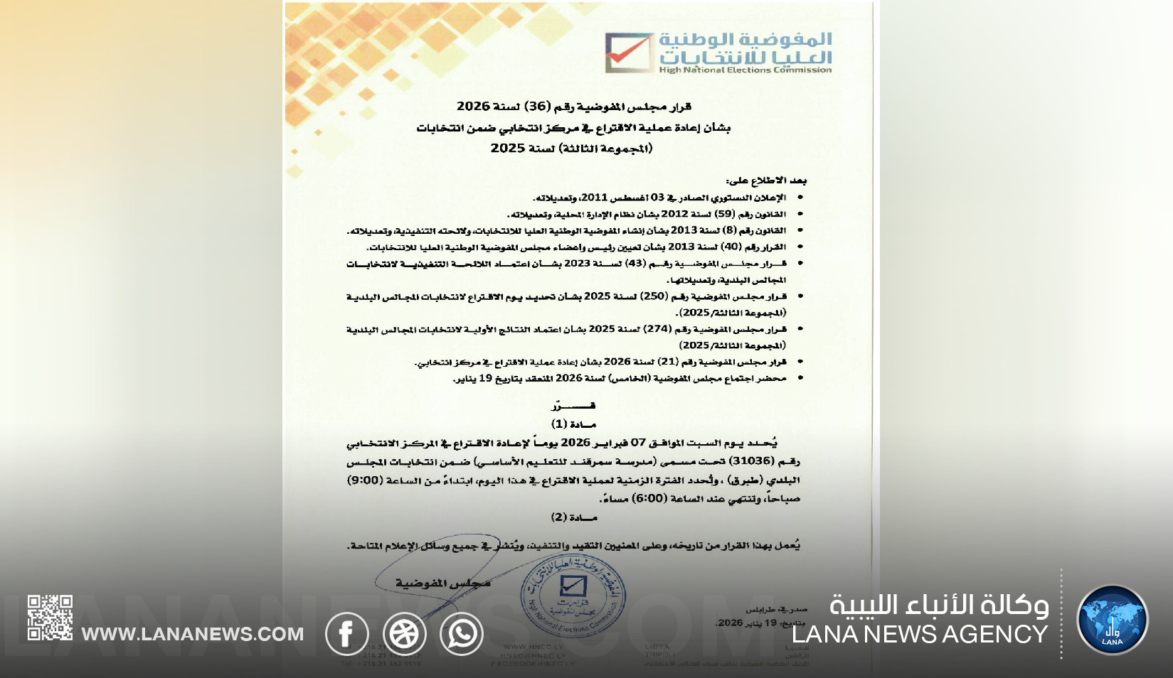 ويأتي الإجراء في إطار استكمال الترتيبات التنظيمية لانتخابات المجالس البلدية، ضِمن انتخابات (المجموعة الثالثة) لسنة 2025، والتي أصدرت المفوضية بشأنها عددًا من القرارات المتعلقة بتحديد يوم الاقتراع، وبدء الحملات الانتخابية، واعتماد القوائم النهائية للمترشحين. (الأنباء الليبية – طرابلس) ر ت