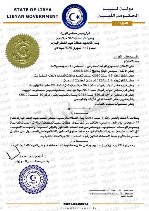بنغازي 20 مارس 2026 (الأنباء الليبية) – أصدر رئيس مجلس الوزراء بالحكومة الليبية أسامة حماد، القرار رقم (57) لسنة 2026 ميلادي، بشأن تحديد عطلة عيد الفطر المبارك للعام 1447 هجري، وذلك في إطار تنظيم مواعيد العمل الرسمية بالدولة.
