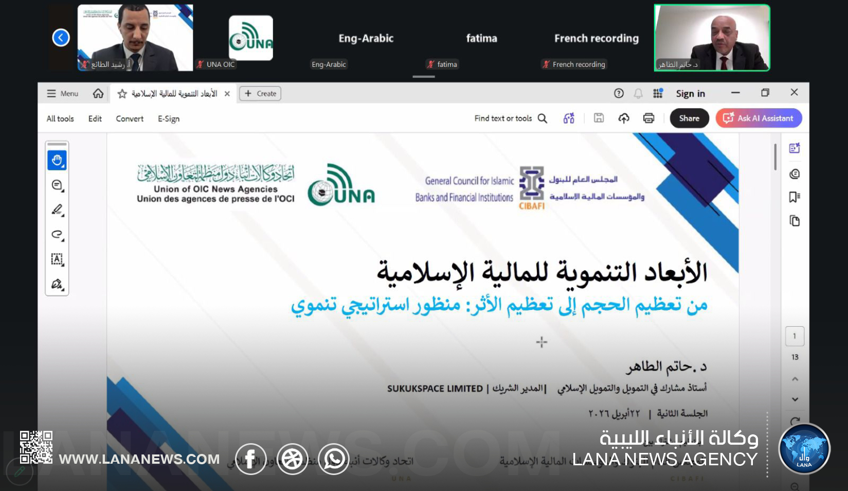 جدة 22 أبريل 2026 (الأنباء الليبية)- نظّم اتحاد وكالات أنباء دول منظمة التعاون الإسلامي يونا، والمجلس العام للبنوك والمؤسسات المالية الإسلامية، ندوةً افتراضية للإعلاميين في مدينة جدة، حول “المفاهيم والتطبيقات العامة للتمويل الإسلامي: مقدمة للصحفيين”.