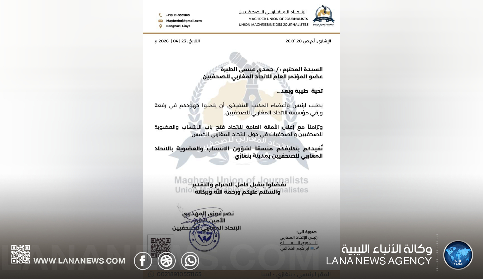 بنغازي 27 أبريل 2026 (الأنباء الليبية)- أصدر الاتحاد المغاربي للصحفيين، قرارًا بتكليف “حمدي عيسى الطيرة”؛ مُنسقًا لشؤونِ الانتساب والعضوية في مدينة بنغازي، في إطار جهود الاتحاد لتنظيمِ العمل الإداري وتوسيع قاعدة العضوية داخل الدول المغاربية.