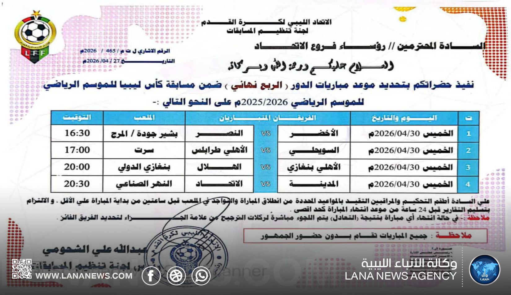 وأعلن الاتحاد الليبي لكرة القدم؛ عبر لجنة تنظيم المسابقات عن برنامج مباريات هذا الدور، حيث تُقام جميع المواجهات يوم الخميس الموافق 30 أبريل 2026، وسط ترقب كبير لما ستسفر عنه من نتائج.