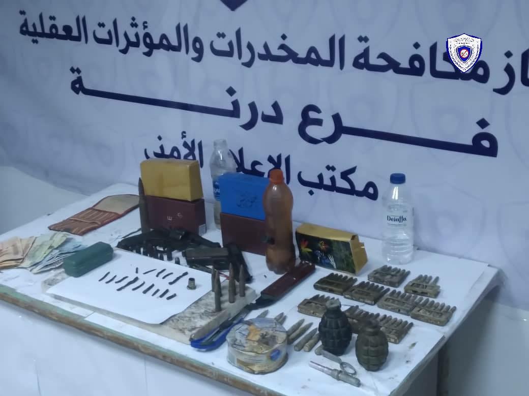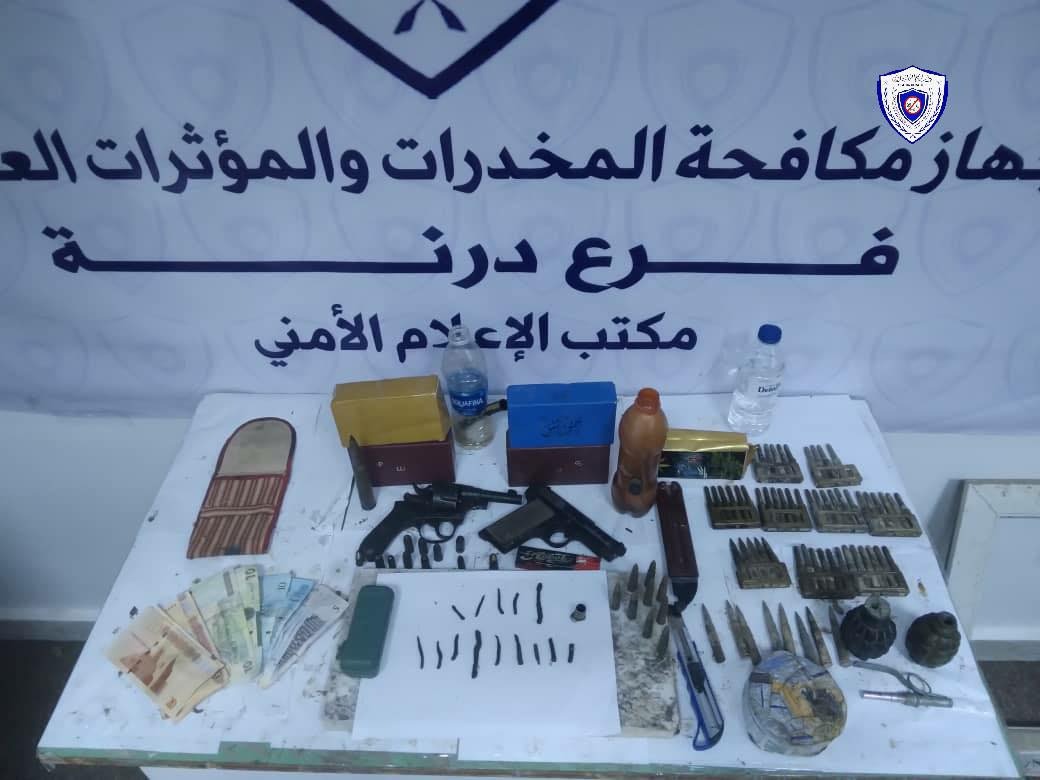 في المقابل، ألقى عناصر الجهاز فرع درنة، القبض على تاجر بحوزته 14 قطعة من مادة حشيش، وعدد من أسلحة نارية وذخائر، وإحالته إلى النيابة العامة بعد اتخاذ الإجراءات القانونية وانتهاء التحقيق معه.