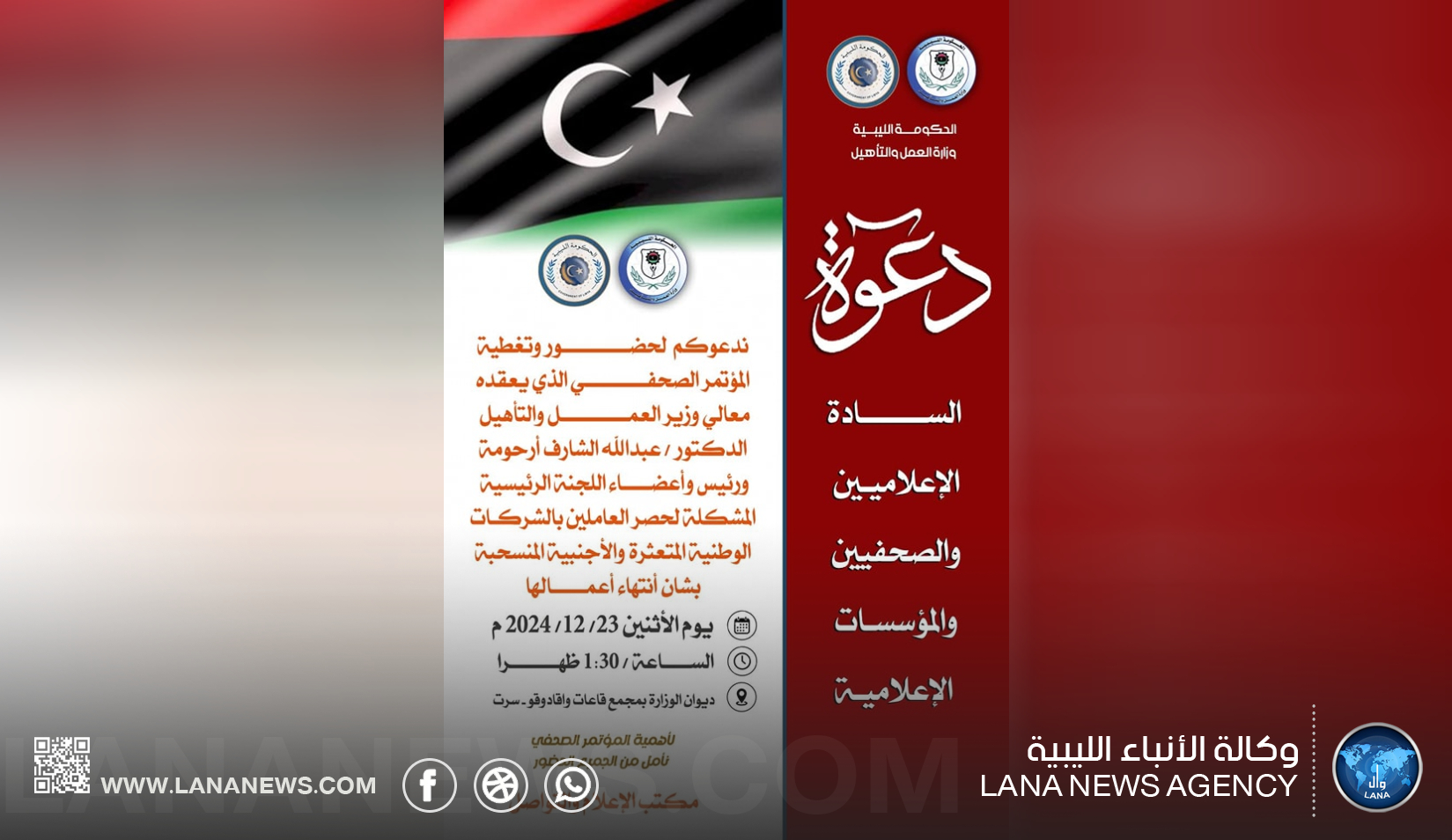 كما دعت الوزارة الإعلاميين والصحفيين والمؤسسات الإعلامية ومراسلي القنوات الفضائية لتغطية الحدث، الذي سيعقد على تمام الساعة 1:30 ظهرًا. (الأنباء الليبية – سرت) ر ت