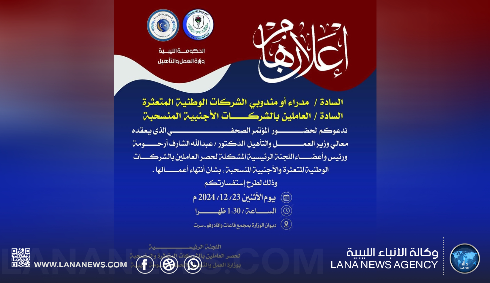 سرت 21 ديسمبر 2024 (الأنباء الليبية) – يعقد وزير العمل والتأهيل، عبد الله الشارف أرحومة، يوم الإثنين المقبل، مؤتمرًا صحفيًا بمقر ديوان الوزارة في مجمع قاعات واقادوقو بمدينة سرت.