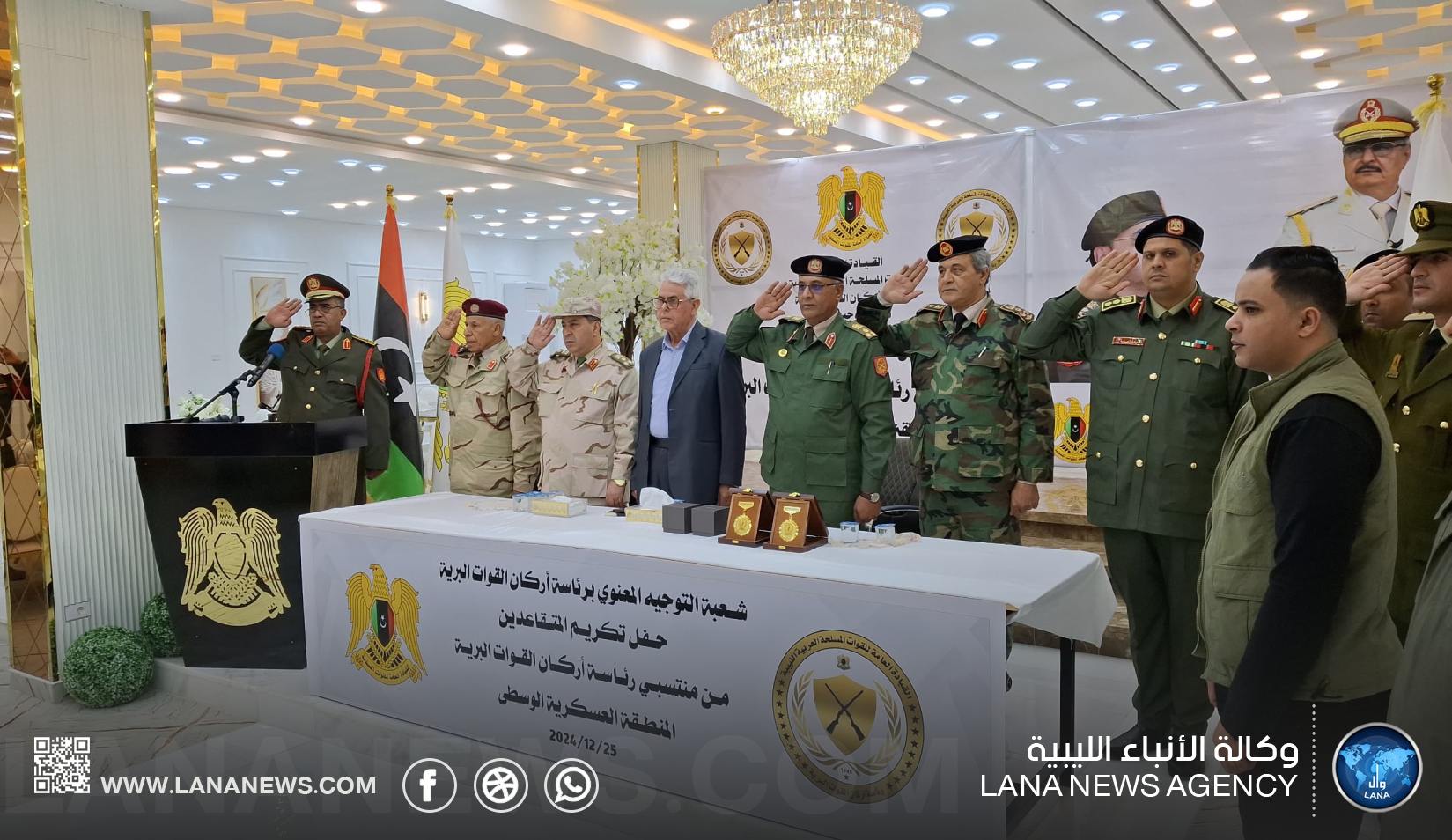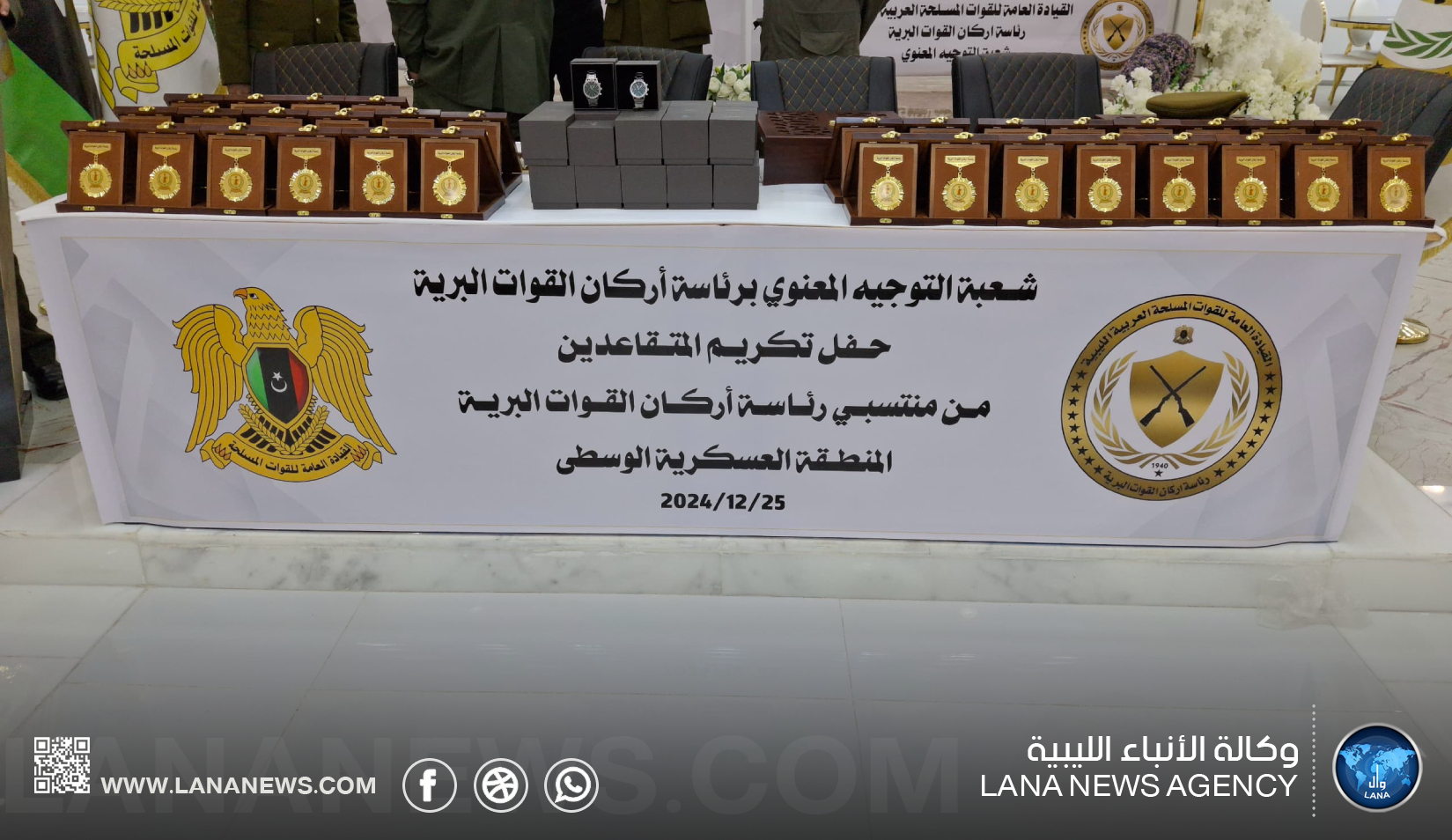سرت 25 ديسمبر 2024 (الأنباء الليبية) – نظمت شعبة التوجيه المعنوي برئاسة أركان القوات البرية حفلًا في مدينة سرت، خصص لتكريم عدد من المتقاعدين من منتسبي رئاسة أركان القوات البرية بالمنطقة الوسطى، تقديرًا لجهودهم وتضحياتهم خلال مسيرتهم المهنية في خدمة الوطن.