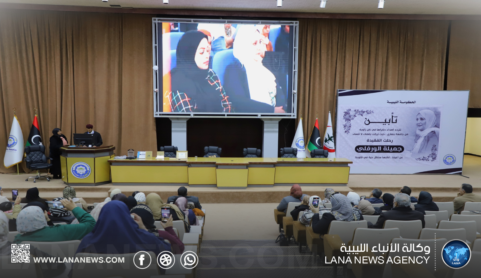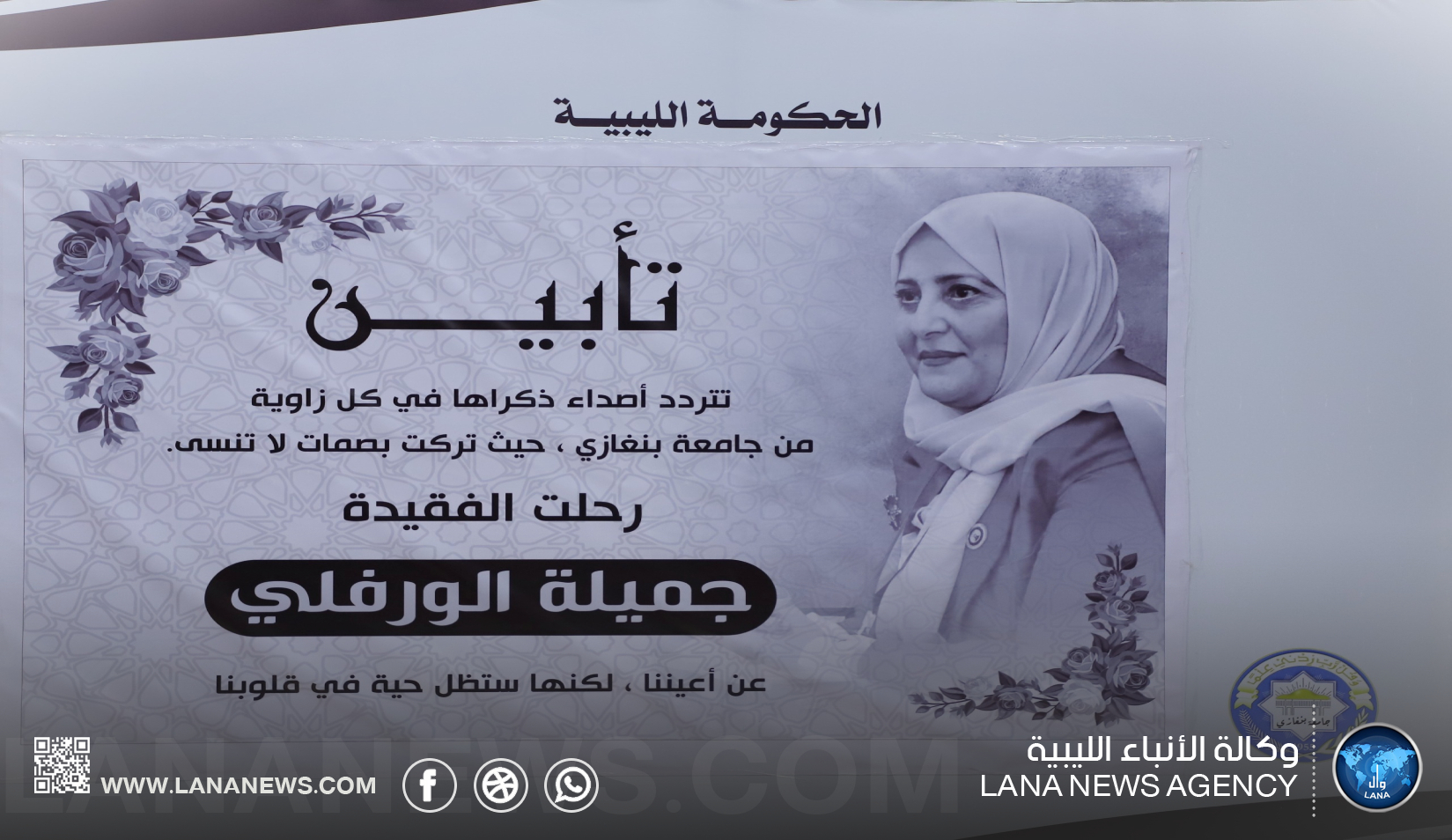 بنغازي 18 يناير 2025 (الأنباء الليبية) – أقامت جامعة بنغازي اليوم السبت، مراسم تأبين للأستاذة جميلة مفتاح أمجاهد الورفلي، رئيسة قسم الجودة في إدارة المسجل العام بالجامعة، التي وافتها المنية في السابع من يناير الجاري إثر حادث سير أليم.
