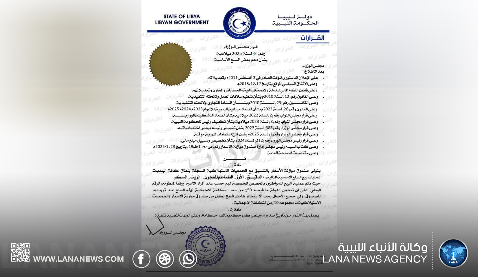 بنغازي 25 يناير 2025 (الأنباء الليبية) – أصدر مجلس وزراء الحكومة الليبية، قرارًا بشأن دعم بعض السلع الأساسية في البلاد.