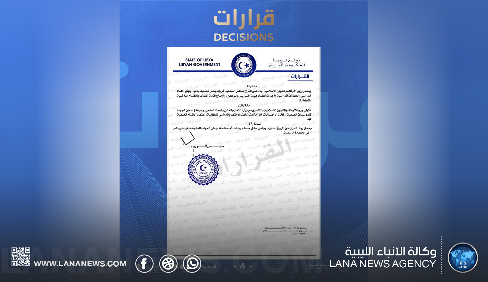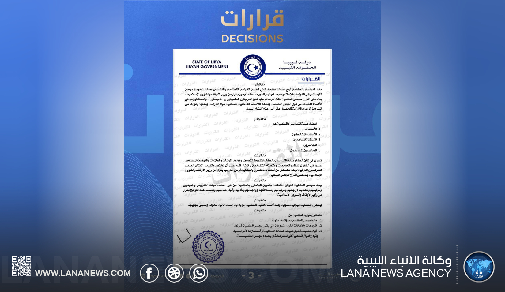 كما نص القرار على أن مدة الدراسة في الكلية هي أربع سنوات، للحصول على درجة الليسانس في الدراسات الإسلامية، مع إمكانية فتح برامج دراسات عليا (ماجستير/دكتوراه) في المستقبل، وفقًا لما يراه مجلس الكلية مناسبًا. (الأنباء الليبية – بنغازي) ر ت