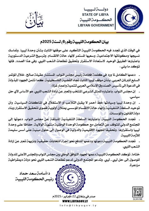 وأوضحت الحكومة أن مجلس النواب، باعتباره الممثل الشرعي المنتخب والمعبر عن إرادة الشعب الليبي، هو الأساس لأي حل سياسي، مشيرة أن وحدة ليبيا وسيادتها خط أحمر لا يمكن التلاعب أو الاستغلال به في المناكفات السياسية، مؤكدة أن توحيد السلطة التنفيذية وإنهاء حالة الانقسام المؤسسي يمثلان أولوية قصوى لتحقيق الاستقرار وبناء دولة القانون والمؤسسات.