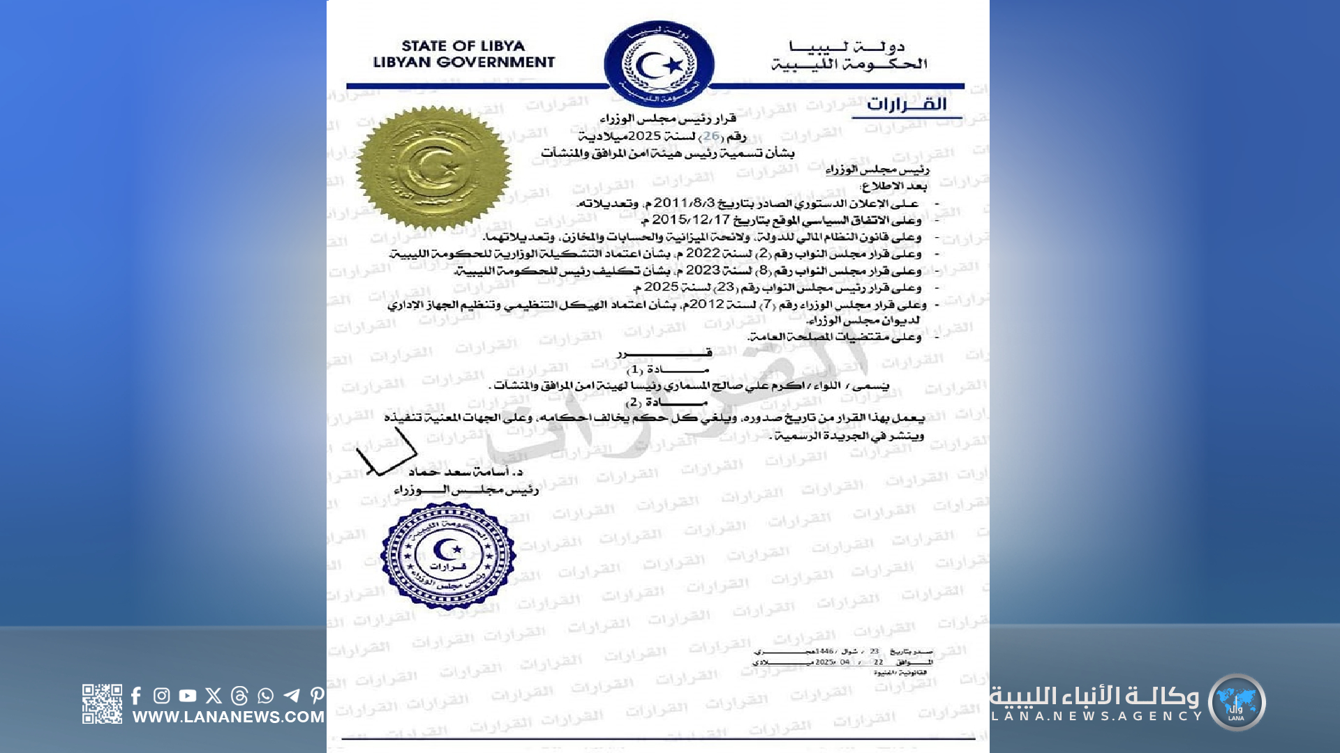 بنغازي 22 أبريل 2025 (الأنباء الليبية) – أصدر رئيس مجلس الوزراء، الدكتور أسامة حماد، القرار رقم (26) لسنة 2025 بتسمية اللواء أكرم علي صالح المسماري، رئيسًا لهيئة أمن المرافق والمنشآت.