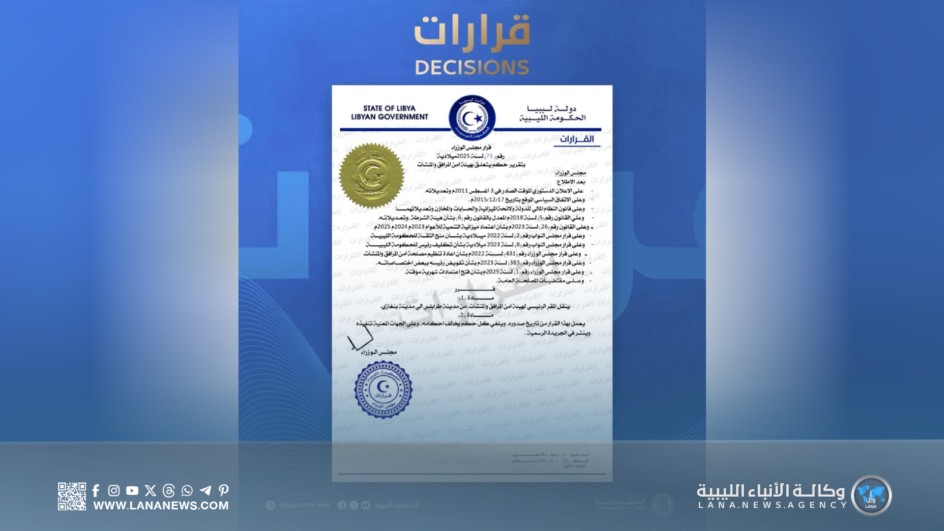 وفي سياق آخر، أصدر رئيس مجلس الوزراء القرار رقم (75) لسنة 2025، الذي ينص في مادته الأولى، على نقل المقر الرئيسي للهيئة من مدينة طرابلس إلى مدينة بنغازي. (الأنباء الليبية – بنغازي) ر ت