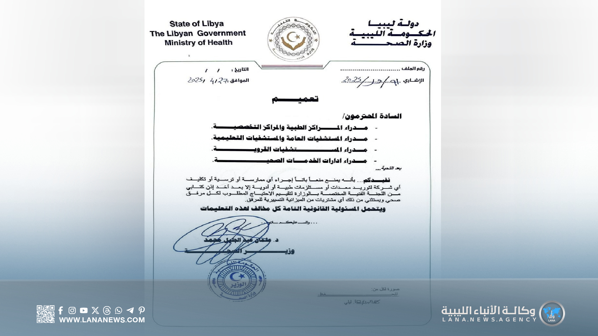 بنغازي 27 أبريل 2025 (الأنباء الليبية) – طالبت وزارة الصحة بالحكومة الليبية إدارات المراكز الطبية والتخصصية، والمستشفيات العامة والتعليمية، ومستشفيات العزل، والخدمات الصحية بالمناطق، بالامتناع عن اتخاذ أي إجراءات تتعلق بإبرام عقود توريد أو مستلزمات أو مستندات مالية إلا بعد الحصول على إذن كتابي رسمي من الوزارة واللجنة الفنية المختصة.