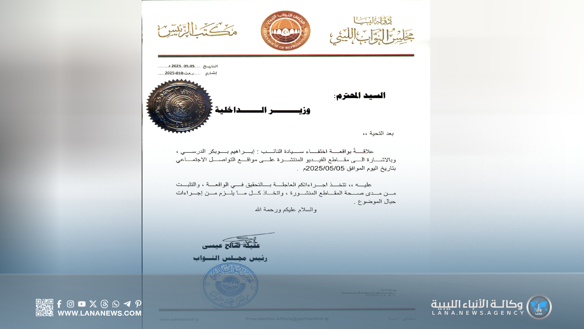 بنغازي 05 مايو 2025 (الأنباء الليبية) – صرّح المتحدث الرسمي باسم مجلس النواب، عبد الله بليحق، أن رئيس مجلس النواب وجّه خطابًا رسميًا إلى النائب العام ووزير الداخلية، دعا فيه إلى اتخاذ الإجراءات العاجلة، للتحقيق في مقاطع الفيديو المتداولة على مواقع التواصل الاجتماعي بتاريخ اليوم الخامس من مايو والتثبت من مدى صحتها.