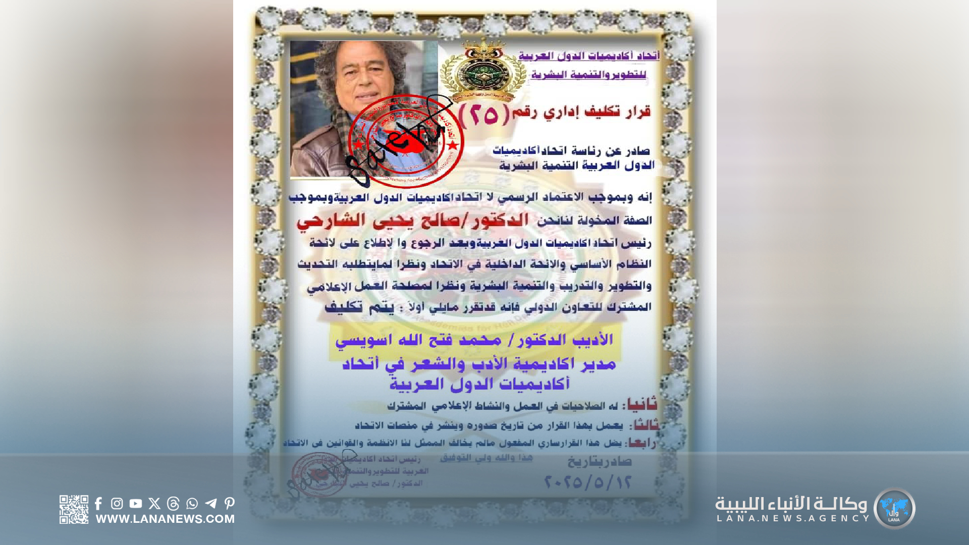 القاهرة 14 مايو 2025 (الأنباء الليبية) – أصدر اتحاد أكاديميات الدول العربية للتطوير والتنمية البشرية، قرارًا بتكليف الأديب الليبي الدكتور محمد فتح الله اسويسي، مديراً لأكاديمية الأدب والشعر التابعة للاتحاد.