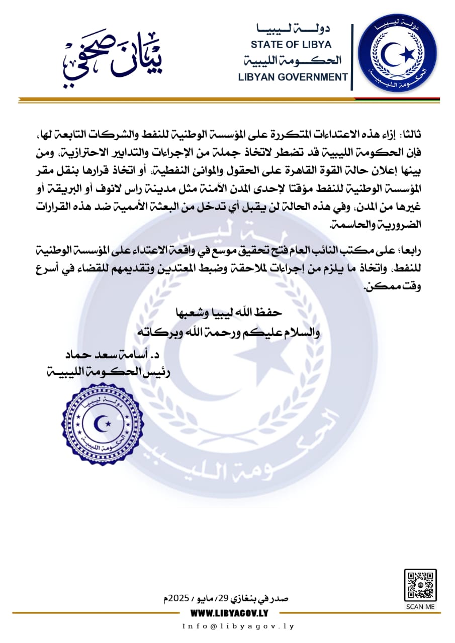 وجددت الحكومة الليبية استنكارها للاعتداءات المتكررة على مؤسسات الدولة من قبل المجموعات المسلحة المدعومة من الحكومة الموازية منتهية الولاية، وحذر من خطورة تهديد المجموعات المسلحة لقطاع النفط، الذي يشكل المصدر الرئيسي لقوت الشعب الليبي.