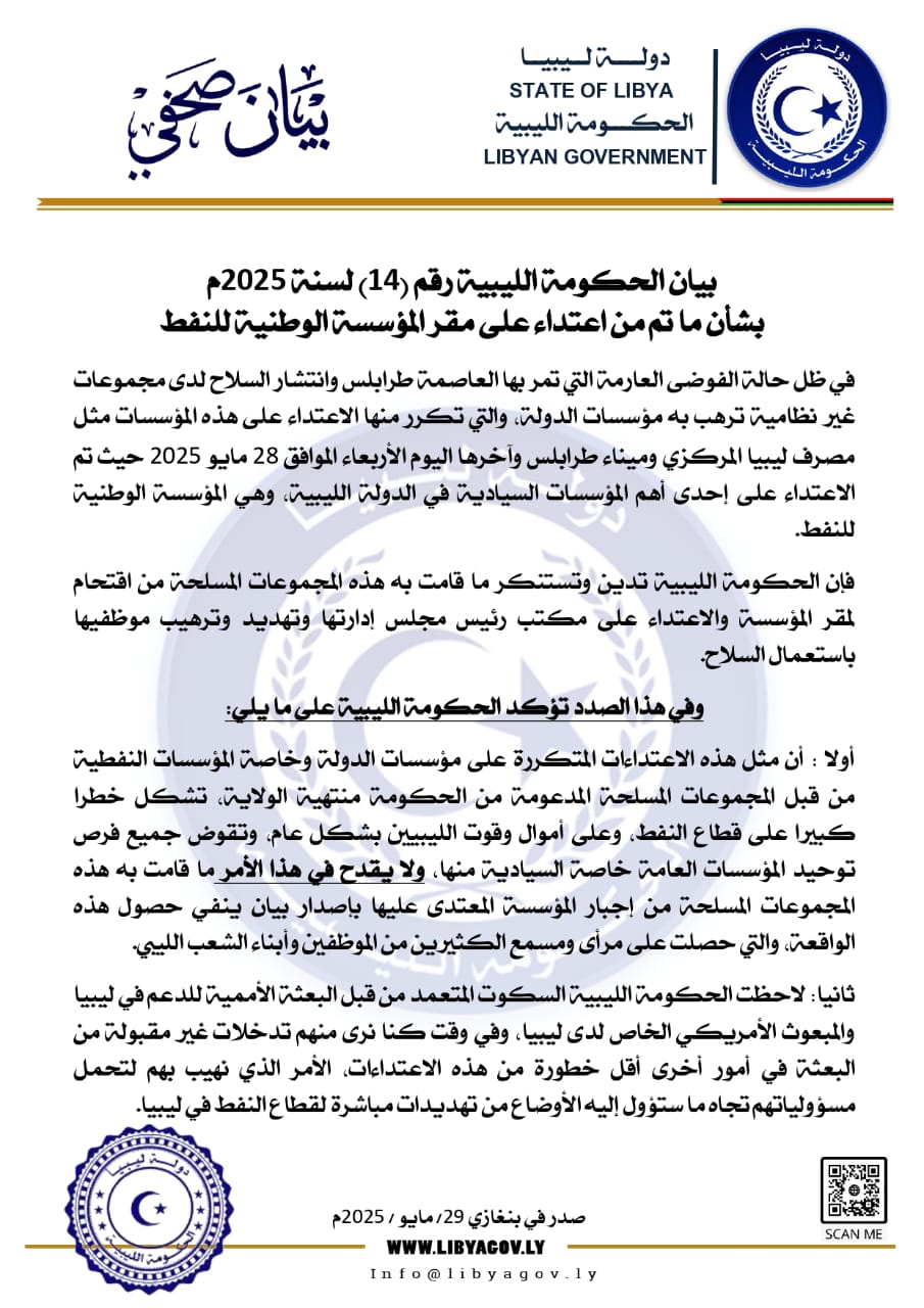 بنغازي 28 مايو 2025 (الأنباء الليبية) – أصدرت الحكومة الليبية اليوم الأربعاء بياناً شديد اللهجة أعربت فيه عن إدانتها واستنكارها لقيام مجموعة مسلحة غير نظامية بالاعتداء السافر على مقر المؤسسة الوطنية للنفط بالعاصمة طرابلس وعلى مكتب رئيس مجلس إدارتها وتهديد وترهيب موظفيها.