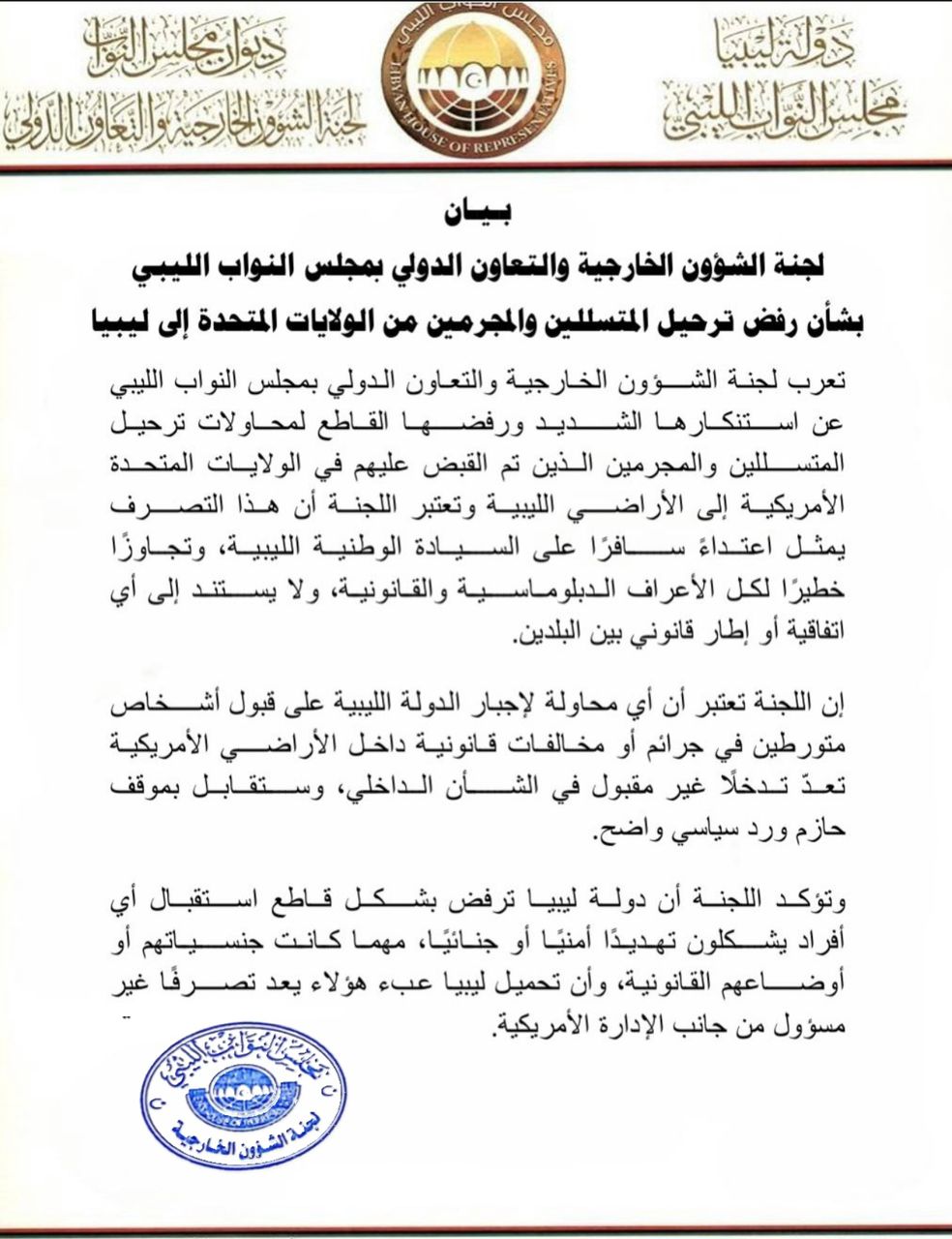 وأشارت اللجنة أن محاولة لإجبار الدولة الليبية على قبول أشخاص متورطين في جرائم أو مخالفات قانونية داخل الأراضي الأمريكية تعد تدخلا غير مقبول في الشأن الداخلي وستقابل بموقف حازم ورد سياسي واضح.