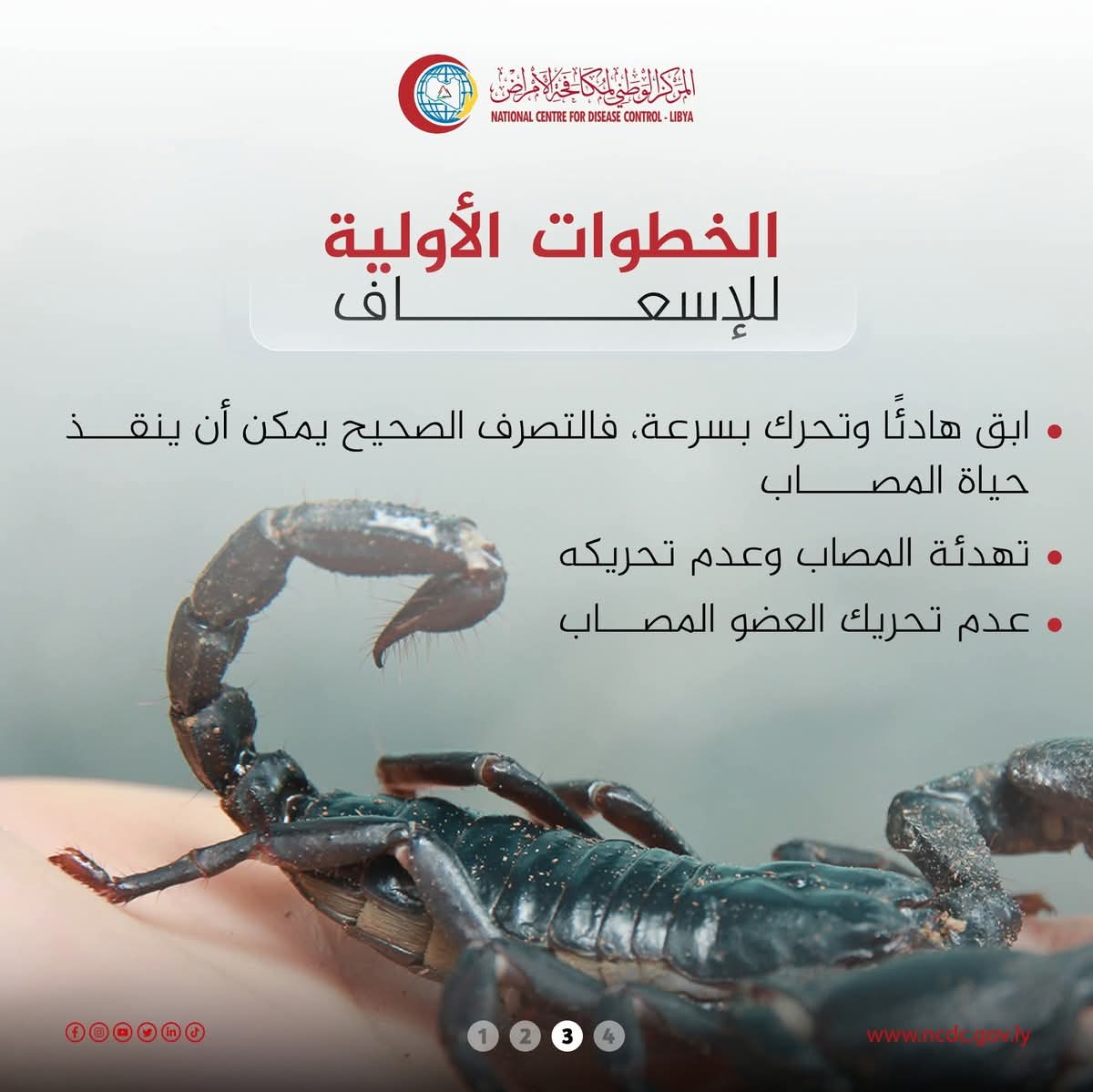 وختم المركز دعوته بالتأكيد على أهمية الوقاية، عبر ارتداء الأحذية ليلاً، وتفقد الأغطية والأحذية قبل الاستخدام، والابتعاد عن الأماكن المهجورة أو غير النظيفة التي قد تكون مأوى للعقارب. (الأنباء الليبية ـ طرابلس) ه ع