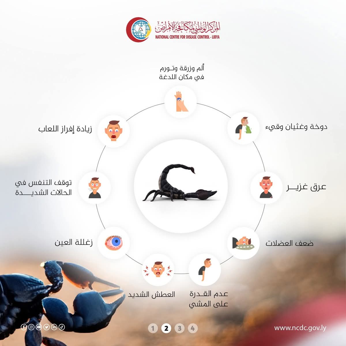 طرابلس 30 يونيو 2025 (الأنباء الليبية) ـ حذر المركز الوطني لمكافحة الأمراض من ارتفاع معدلات لدغات العقارب في ليبيا خلال الأشهر الحارة (مايو إلى أكتوبر)، داعيًا المواطنين إلى اتخاذ الاحتياطات اللازمة، والالتزام بإجراءات الإسعاف الأولي عند التعرض للدغ، خاصة في المناطق الجنوبية والريفية التي تسجّل أعلى نسب الإصابات.