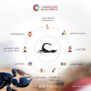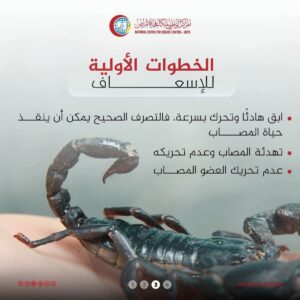 وأوضح المركز، في بيان توعوي، أن أعراض اللدغة تختلف حسب نوع العقرب وكمية السم، لكن أبرزها ألم حارق شديد، وتورم موضعي، وتنميل، يرافقه أحيانًا غثيان، خفقان، تعرق غزير، وصعوبات تنفسية قد تتطور إلى مضاعفات خطيرة تهدد الحياة، خصوصًا لدى الأطفال وكبار السن ومرضى القلب والرئة.