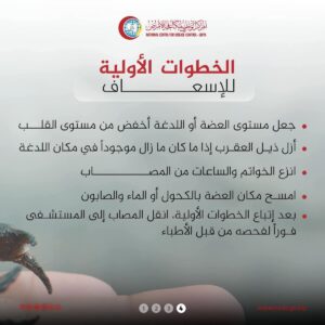 وأكد المركز أهمية التدخل الإسعافي السريع، مشددًا على الإجراءات العلاجية كتهدئة المصاب، تثبيت الطرف المصاب، تنظيف مكان اللدغة، استخدام كمادات باردة، والاتصال الفوري بالإسعاف أو نقل المصاب إلى أقرب مركز صحي مجهّز بمصل مضاد للسم، مشيرًا إلى ضرورة تجنب الممارسات الخاطئة مثل شفط السم أو ربط الطرف المصاب برباط ضاغط.