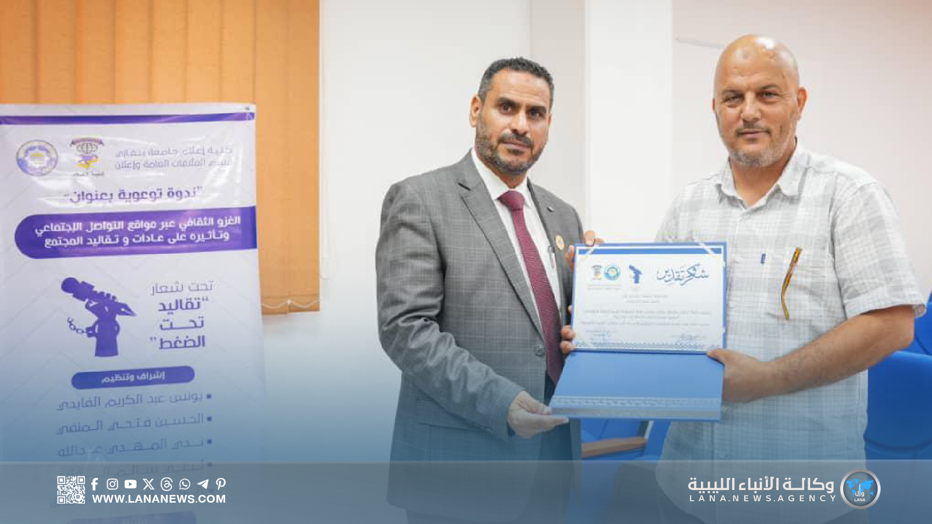 بنغازي 02 يوليو 2025 (الأنباء الليبية) – نظمت كلية الإعلام بجامعة بنغازي اليوم الأربعاء، ندوة علمية هادفة تحت شعار “تقاليد تحت الضغط”، تناولت التحديات التي تفرضها وسائل الإعلام الحديثة ومواقع التواصل الاجتماعي على الهوية الثقافية والعادات والتقاليد المجتمعية، بمشاركة عدد من المختصين والخبراء في الإعلام والثقافة.